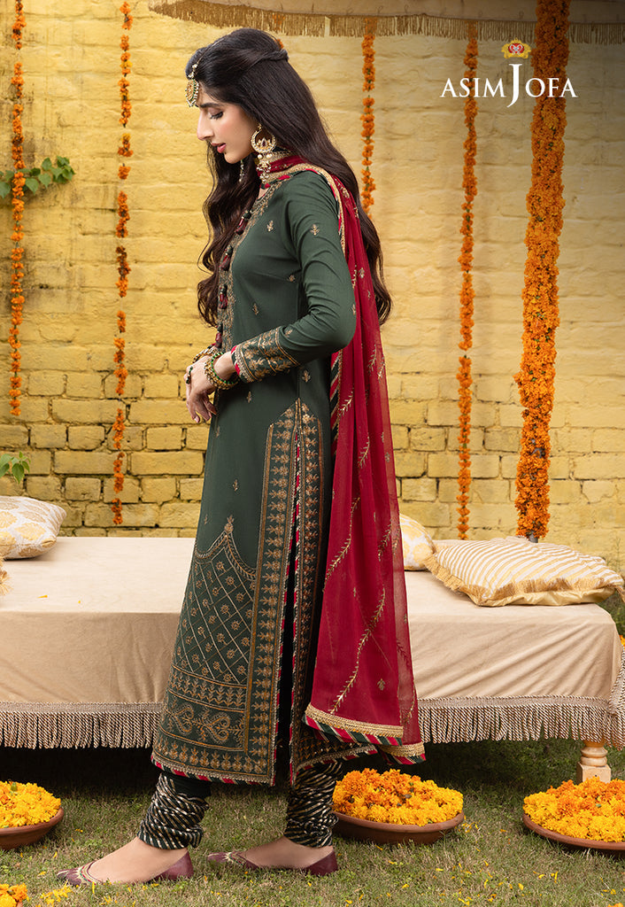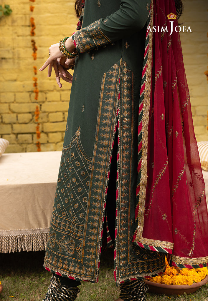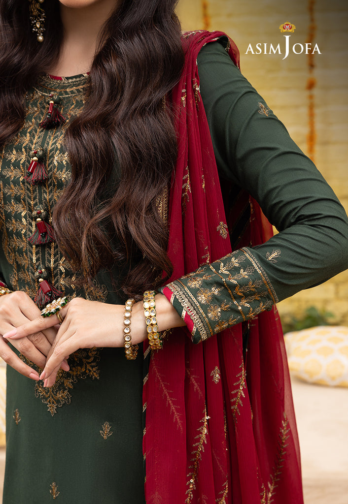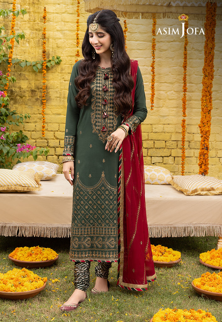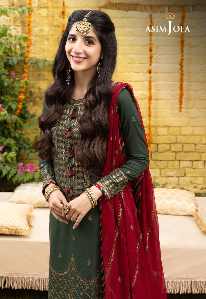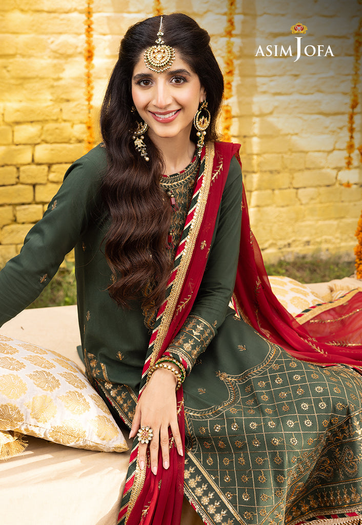 Step into a Garden of Elegance with Mawra Hocane. This Castleton Green ensemble features detailed embroidery on the neckline and borders, enriched with zari and sequins for a touch of opulence. The Ruby-colored dupatta is adorned with diagonal stripes, complemented by sequins and zari. Completing the look is a comfortable churidar pajama. This ensemble seamlessly combines tradition and style, making it perfect for cultural celebrations and elegant gatherings.