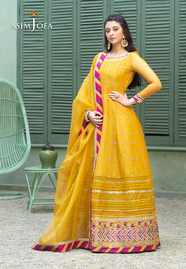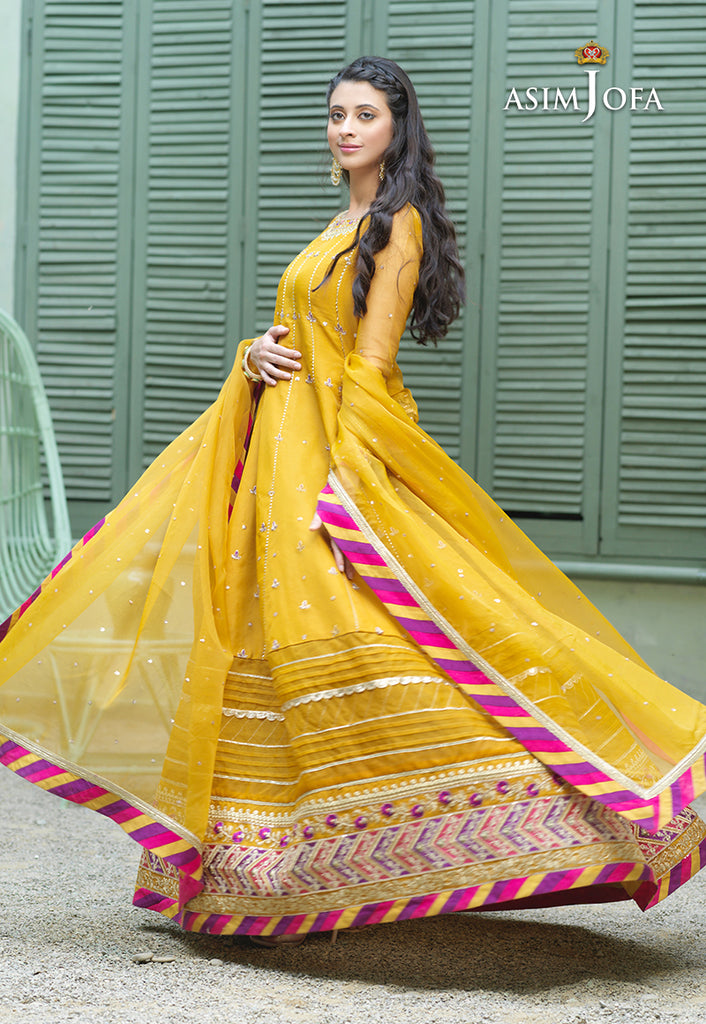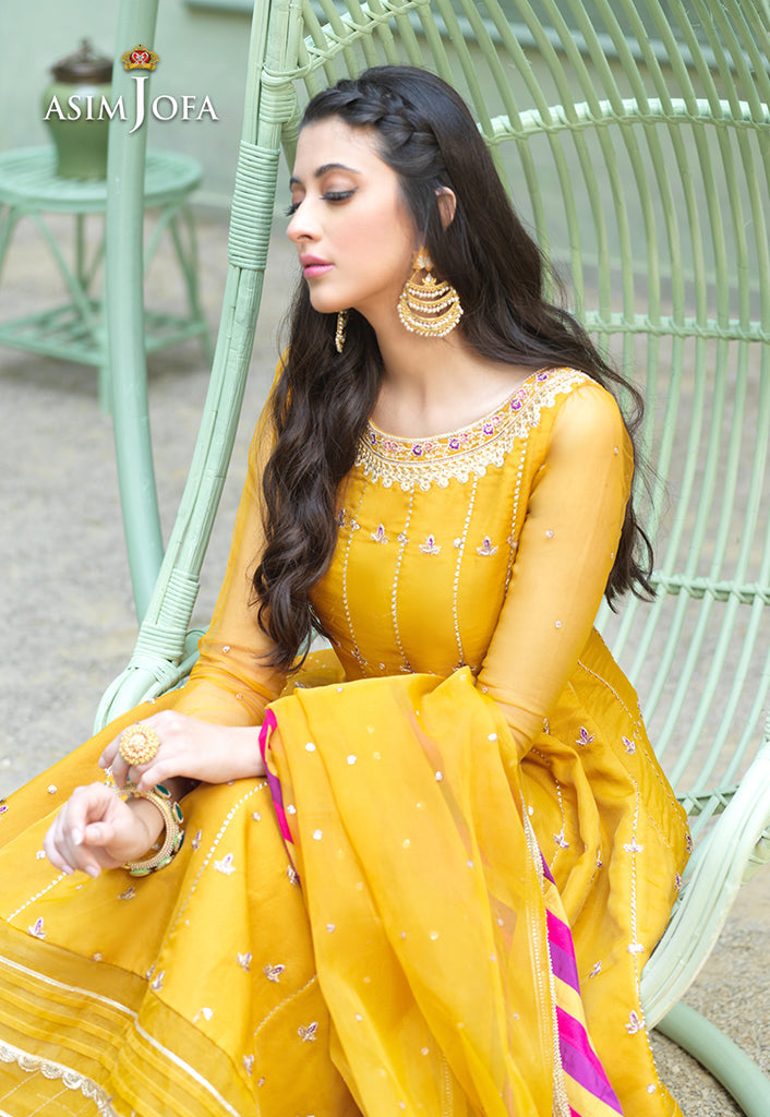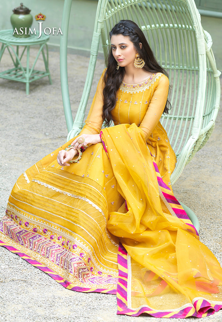 Aglow in this magnificent kalidaar Sabeena truly makes one skip a beat. Intricate booties scattered on mustard gold organza topped with colorful embroidered border worked in chevron pattern inserted with filigree threadwork in shades of aubergine and shocking pink highlighted by touches of golden zari and sequins. A same hued embellished dupatta with dyed cotton silk trouser completes this design.