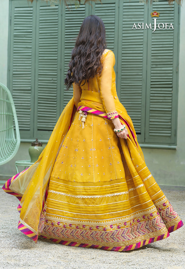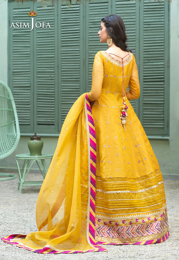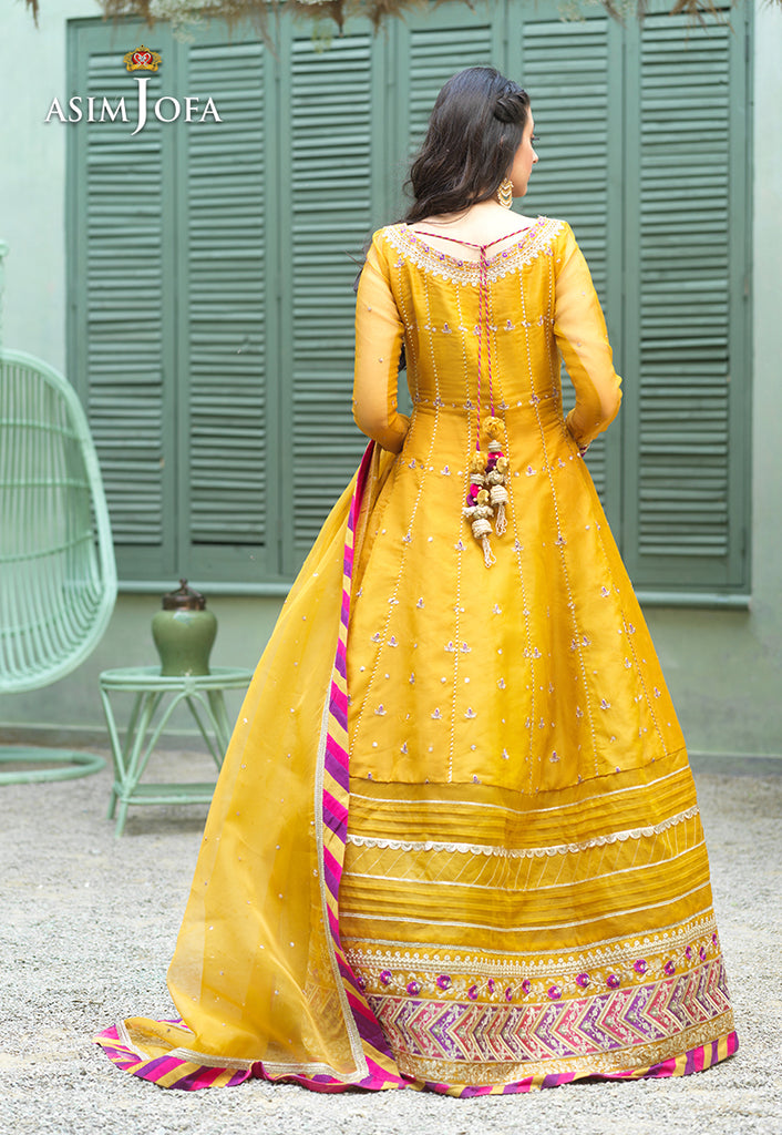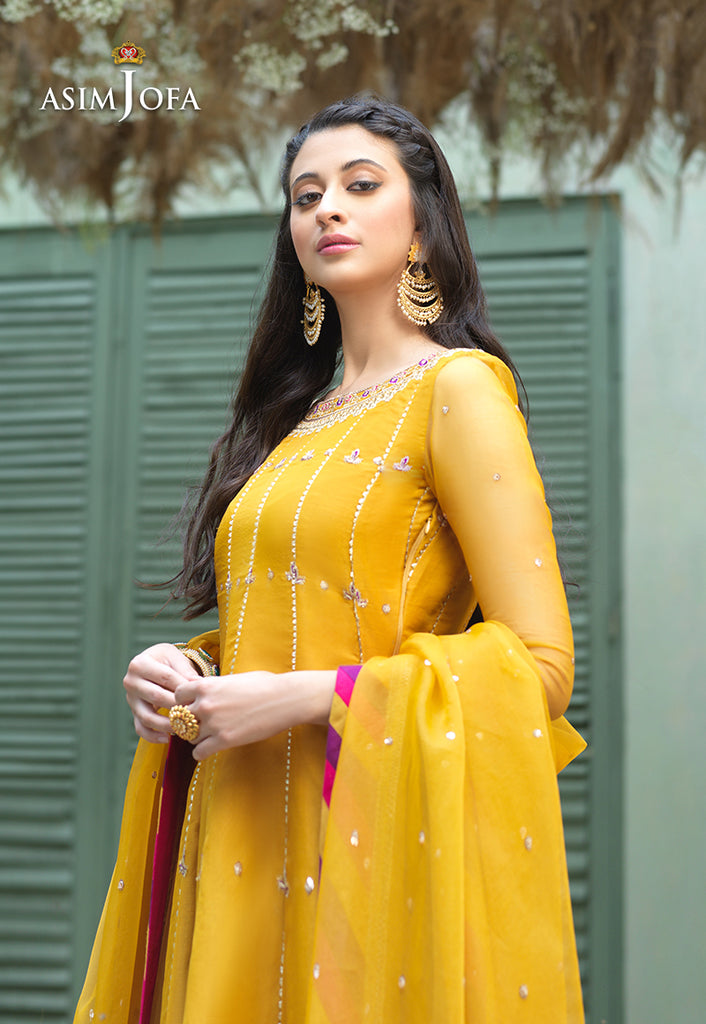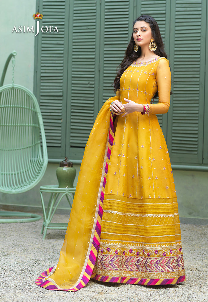 Aglow in this magnificent kalidaar Sabeena truly makes one skip a beat. Intricate booties scattered on mustard gold organza topped with colorful embroidered border worked in chevron pattern inserted with filigree threadwork in shades of aubergine and shocking pink highlighted by touches of golden zari and sequins. A same hued embellished dupatta with dyed cotton silk trouser completes this design.