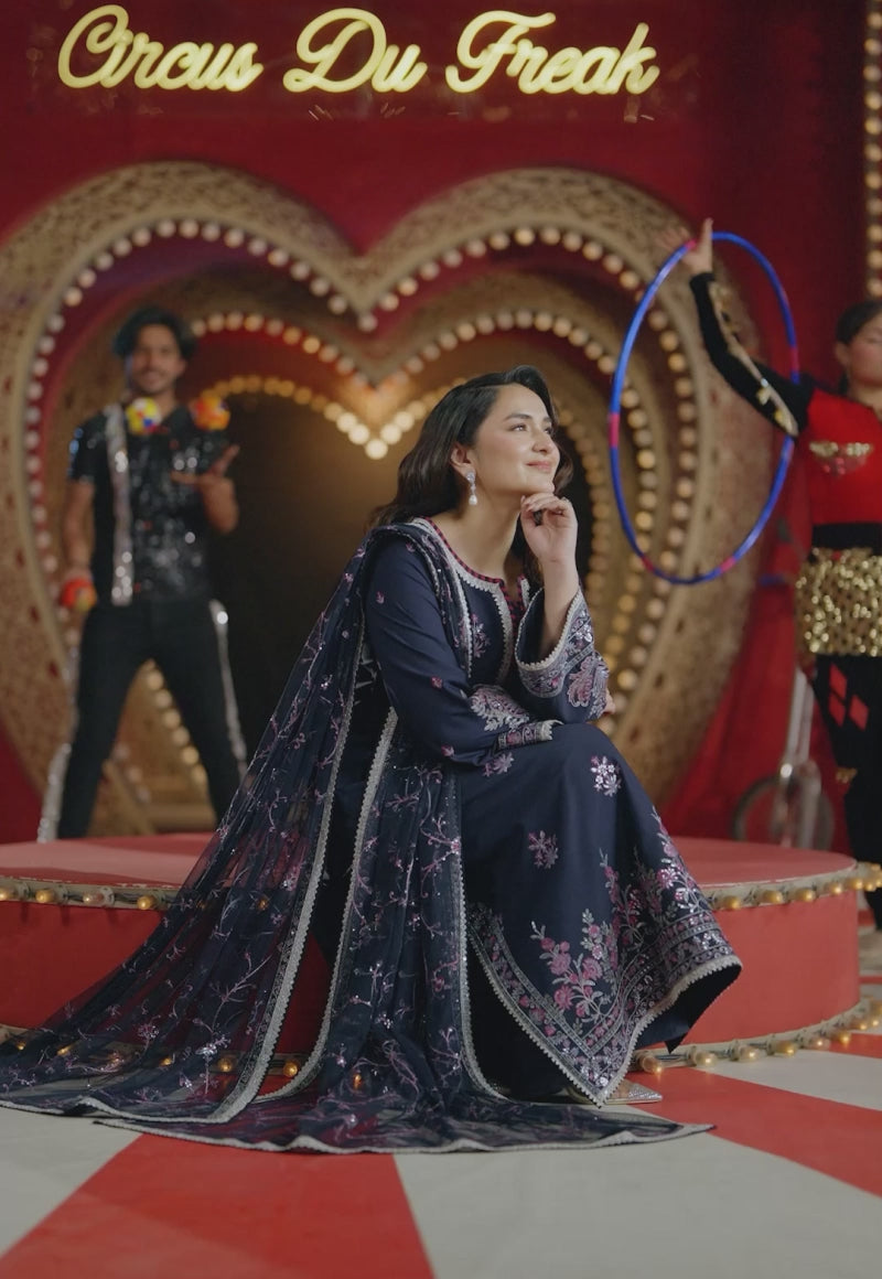 A portrait of refined simplicity, this navy blue ensemble captures the essence of serene sophistication. The shirt is adorned with delicately placed embroidered motifs that whisper elegance, gradually unfolding into a garden-inspired border rich with detail. Shades of magenta and navy thread intertwine with light gold sequins and zari, creating a tapestry that feels both grounded and graceful. The look is completed with a lavishly embroidered dupatta, blooming with all-over foliage patterns that add texture and visual intrigue. A seamless blend of subtlety and opulence.