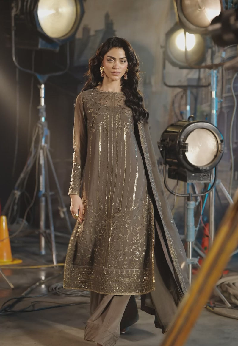 Mysterious and refined, this dark grey ensemble speaks in hushed tones of elegance. The shirt features tonal embroidery that blends seamlessly with the fabric, while subtle sequins lend a soft, translucent glow—like moonlight shimmering on still water. Paired with a minimally embroidered dupatta, the look is effortlessly graceful, allowing the quiet sophistication of the design to shine through. Perfect for those who favor understated beauty with a modern edge.