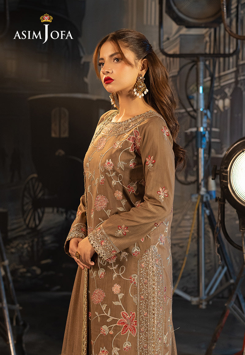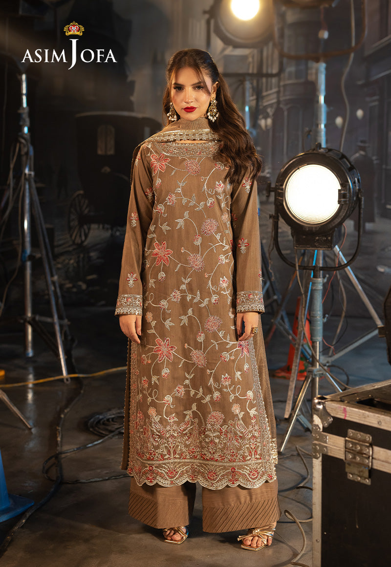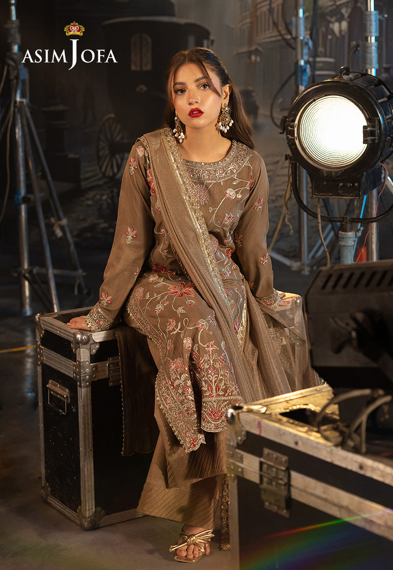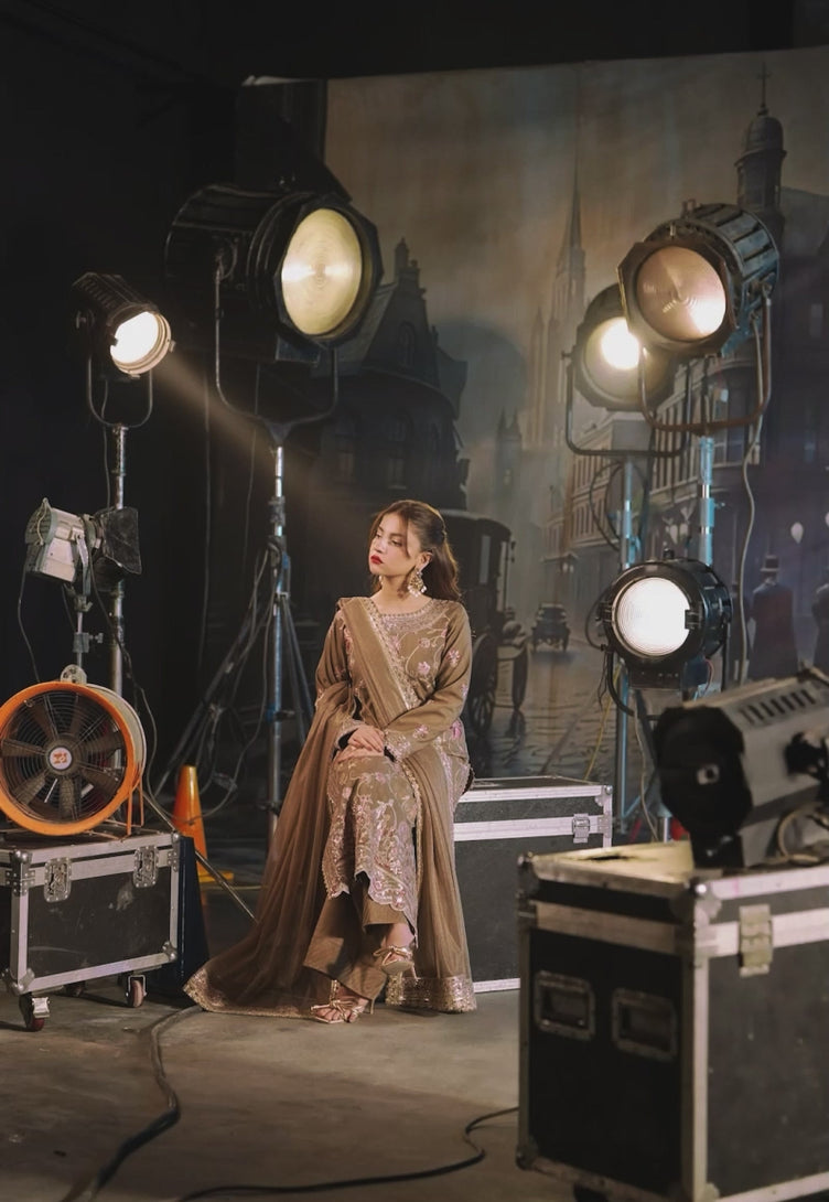 Rich and earthy, this brown ensemble captures a quiet sophistication rooted in tradition. The shirt is adorned with light gold zari and sequins, brought to life with delicate threadwork in light peach, maroon, and beige. A graceful floral pattern flows seamlessly across the fabric, creating a sense of movement and refined charm. Paired with a soft dupatta framed by intricately embroidered borders, the look strikes a perfect balance between elegance and ease—an ensemble that speaks in graceful tones and timeless beauty.