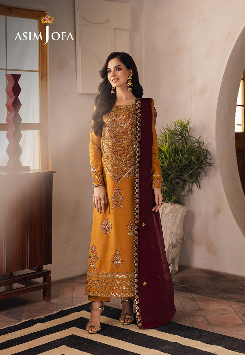 Vibrant and regal, this mustard ensemble shines with two-toned gold zari detailing, adding layers of depth and radiance. Accentuated by maroon threadwork, the design achieves a striking contrast that captures attention. Finished with shimmering 5mm gold sequins and an embroidered chiffon dupatta, this outfit celebrates bold elegance with a hint of traditional charm.