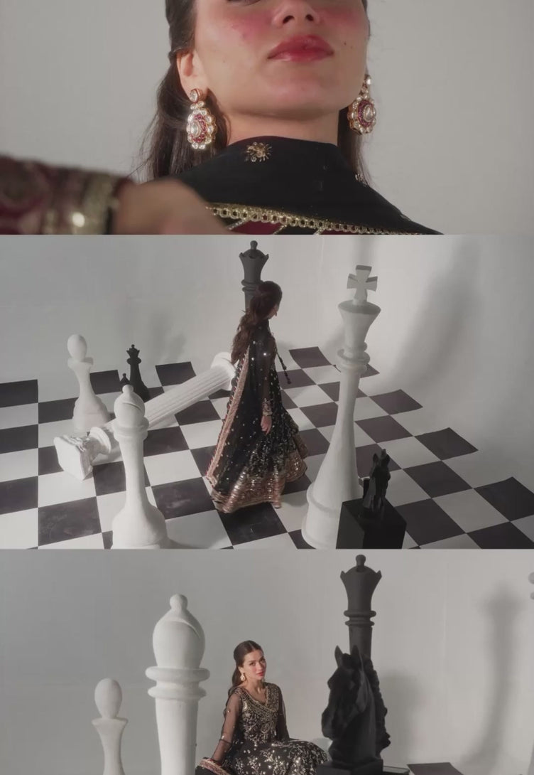 A Serenade from the Sultanate, draped in the grandeur of forgotten courts, this black angrakha reigns like a royal decree etched in thread. Gold zari and glistening 5mm sequins breathe life into its canvas, cascading across the fabric like the opulence of a Mughal Garden at midnight. A maroon border—bold and baroque—frames the silhouette with regal defiance, its embroidery echoing the architectural poetry of ancestral palaces. The ensemble is crowned with a minimalistic dupatta, like a whisper amidst the symphony, grounding its majesty in elegance. This is history, mysticism, and magnificence crafted into form.