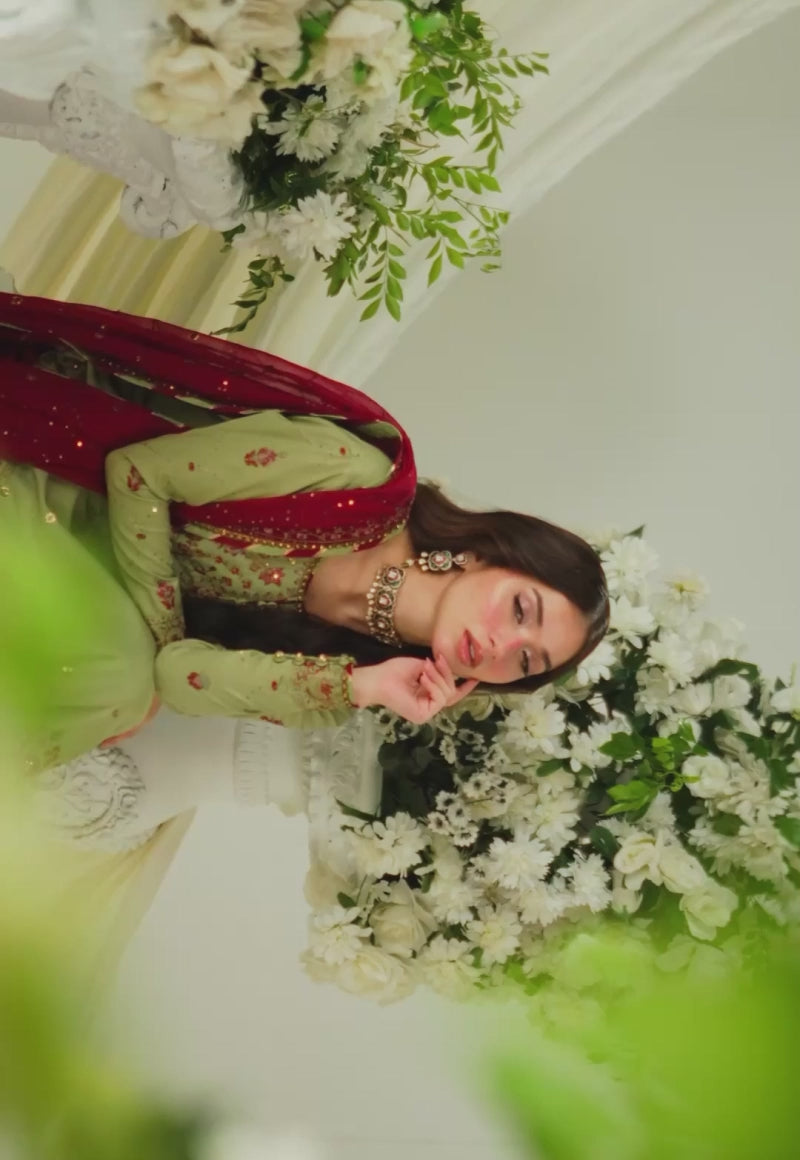 A Garden Awakens in Thread and Light. Like the first breath of spring caught in fabric, this apple green ensemble blossoms with the joy of rebirth. The shirt, painted in the hues of renewal, blooms with floral motifs stitched in rust, tea pink, and sage, each thread a petal, each hue a scent of sunlight. Antique gold zari and sequins glimmer like pollen kissed by morning light, adding a touch of enchantment to the garden it evokes. Paired in contrast with rust-hued trousers and a matching embroidered dupatta, the look becomes a living sonnet—where fabric turns to flora, and the wearer, a muse in full bloom.