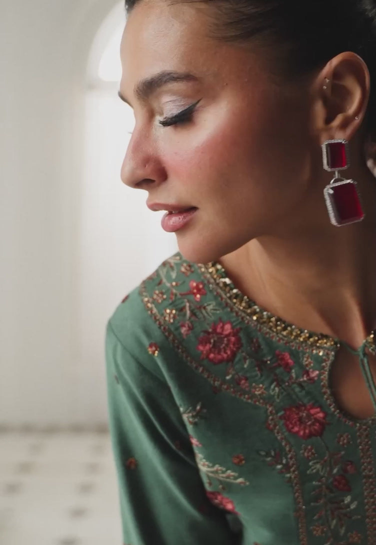 Like a forest drenched in the depth of emerald canopies and kissed by autumn’s flame, this ensemble is a dance between earth and ember. The shirt blossoms with intricate floral embroidery—rust, coral, sage, and mint threads entwined like wild vines under moonlight. Antique gold, in its two-toned sequin and zari form, glimmers like sunlight breaking through leaves. Paired with a rust-hued dhaka pajama/lehenga and dupatta adorned with minimalistic embroidery, the look hums with balance—bold yet grounded, vivid yet serene. It’s the wilderness, refined; a woodland spell sewn for the modern enchantress.