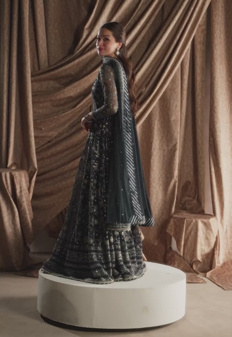 Moonlit waltz in midnight blue, as if spun from the dark skies and stitched with stardust, this deep navy blue kalidaar is a vision born of dreams and devotion. Embroidered from hem to hem with mink-toned two-toned zari and light gold sequins, it shimmers like constellations scattered across a twilight sea. Sixteen cascading kalis give it a regal volume making each step, each twirl like a spell in motion. The flare, rich and poetic, evokes the charm of a fairytale ballroom under moonlight. Paired with a delicately embroidered dupatta, this ensemble doesn't just dress you, it crowns you the heroine of an enchanted night.