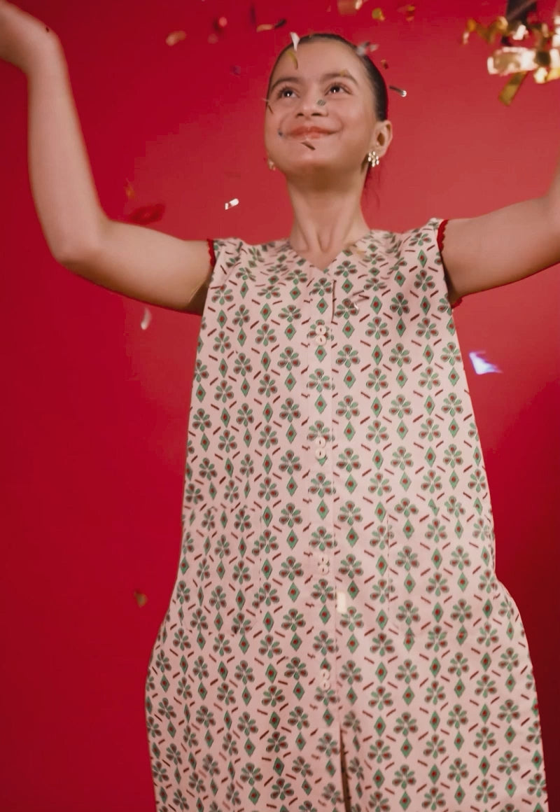 This cheerful dress comes to life with a lively all-over print, capturing the essence of joy through playful shapes and vibrant motifs. Paired with trousers adorned in a contrasting diamond pattern, the ensemble creates a harmonious yet fun look that’s perfect for every little adventure.