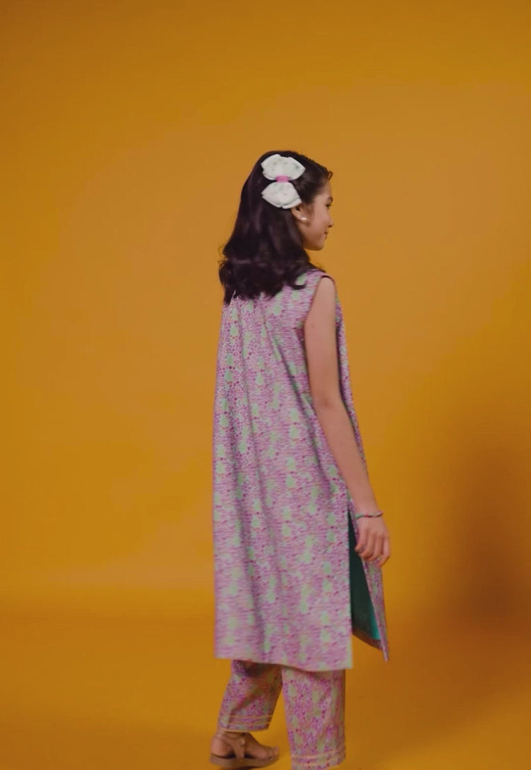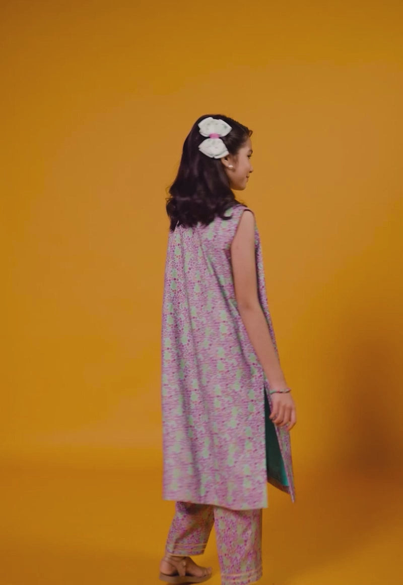 This lovely green outfit blossoms with lavender-hued florals, bringing a soft charm to its angrakha-style shirt. The matching trousers echo the same delightful print, making it a picture-perfect set for joyful days.