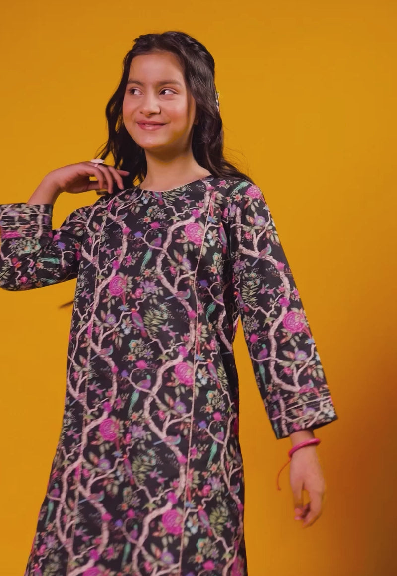Inspired by a forest under a starlit sky, this black outfit captures the magic of nature with its lively print. The trousers echo the same design, creating a storybook-worthy look for little dreamers.