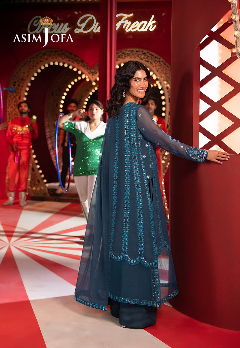 A turquoise canvas, where artistry unfolds with subtlety. The shirt is embroidered with teal threads and silver sequins, defining the shirt's unique design. A scalloped hemline, a graceful partition at the front, and a thoughtfully added patch—each element extends the silhouette, adding length and a sense of fluid movement. Paired with a flimsy dupatta, the outfit achieves a simple yet coherent look, ensuring all eyes are drawn to the shirt's captivating details.