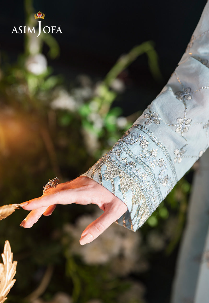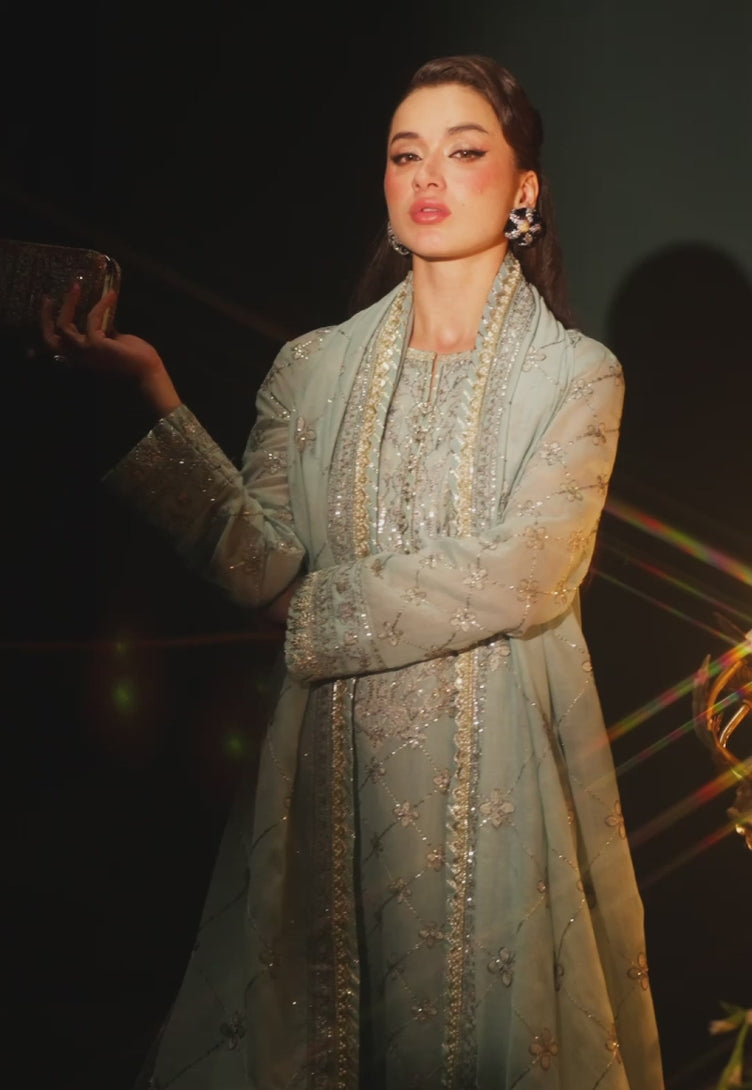 The serene charm of pastel hue takes over this ensemble, making it a vision of timeless grace. The shirt is lavished with all-over embroidery, where light gold zari glimmers softly against the fabric, intertwined with off-white threadwork that lends a gentle refinement. Tiny cupped sequins scatter like dewdrops, adding a subtle glisten to every movement. Paired with a beautifully embroidered dupatta, the look captures a delicate harmony of elegance and poise, perfect for moments that call for quiet sophistication.