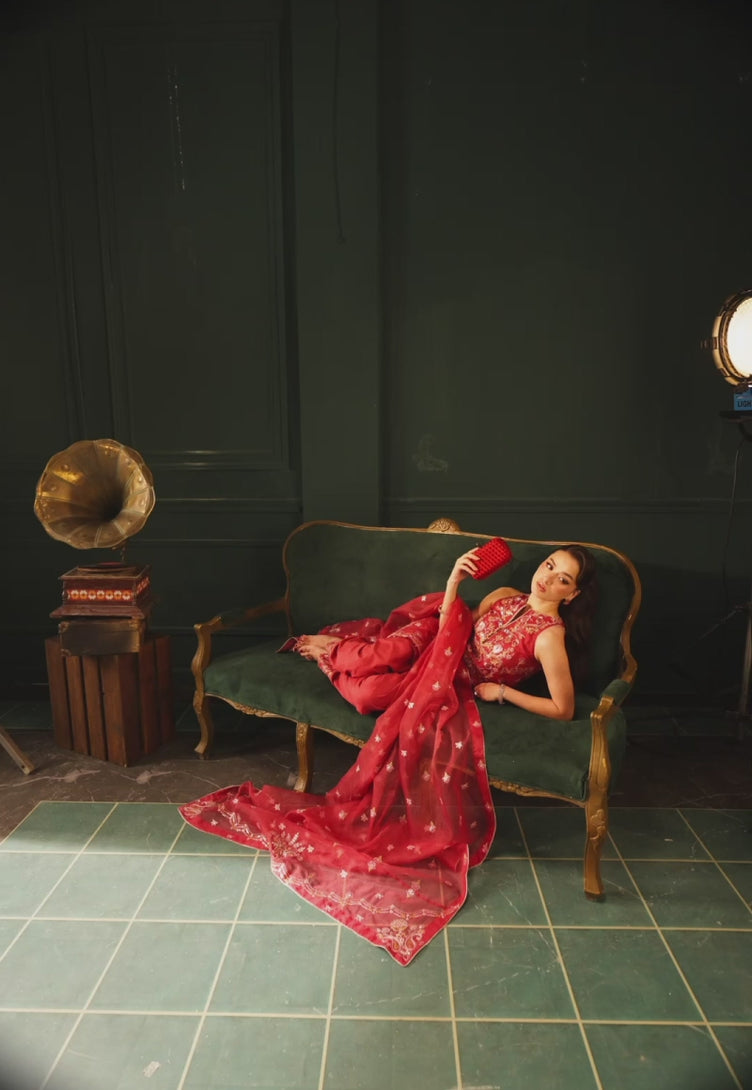 This coral pink ensemble embodies timeless grace with its intricately embroidered shirt, highlighted by a scalloped border that frames the design with finesse. Light copper zari and sequins lend a gentle radiance, enhancing the understated charm of the hue. The dupatta is richly embroidered, with its ornate pallus serving as the true highlight of the look. Offering versatile styling options, the ensemble can be stitched in multiple ways, with borders thoughtfully designed to be placed on sleeves or trousers depending on your preferred silhouette.