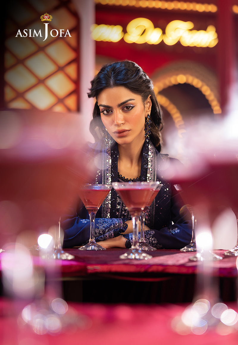 Bathed in the midnight charm of navy blue, this outfit exudes quiet sophistication. The shirt draws immediate attention to its exquisitely crafted neckline—an ornate masterpiece where two-toned antique silver zari meets shimmering silver sequins in a dance of dusk and moonlight. Subtle threadwork in greyish purple and navy blue hues glide across the fabric, creating a symphony of shadow and shimmer. Complemented by intricately embroidered trousers and a minimally embroidered dupatta, this ensemble is a harmonious blend of regal flair and modern artistry—perfect for evenings that demand a touch of grandeur.