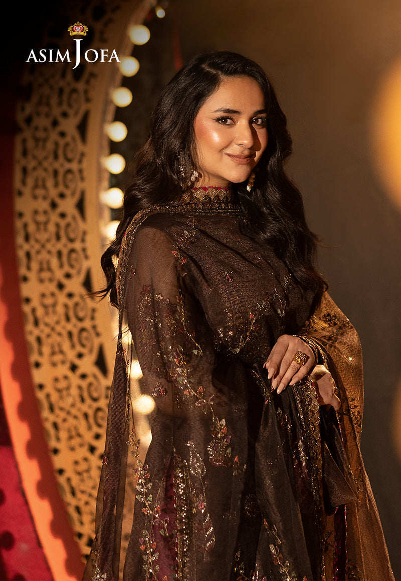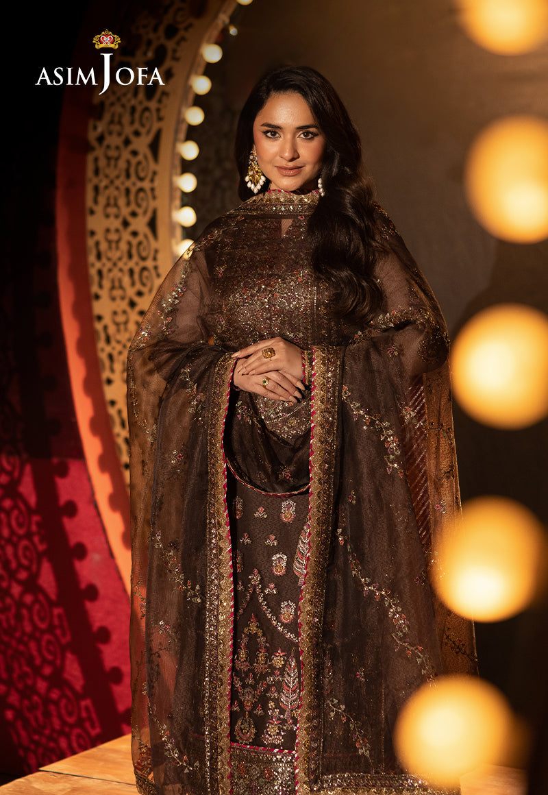 Rich and resplendent, this dark brown ensemble is a tapestry of earthy elegance and artistic finesse. The shirt is exquisitely embroidered with two-toned antique gold zari and shimmering light gold sequins, casting a warm, radiant glow. Threadwork in sage green, purple, rust, and deep beige hues flows across the fabric like a painter’s palette brushed with nature’s finest tones. The ensemble is thoughtfully paired with a floral-printed trouser in a contrasting hue, completed with an embroidered hem that adds a playful yet polished finish. A gorgeously embroidered dupatta ties the look together, echoing the ensemble’s intricate charm and creating a harmonious blend of allure and grace.