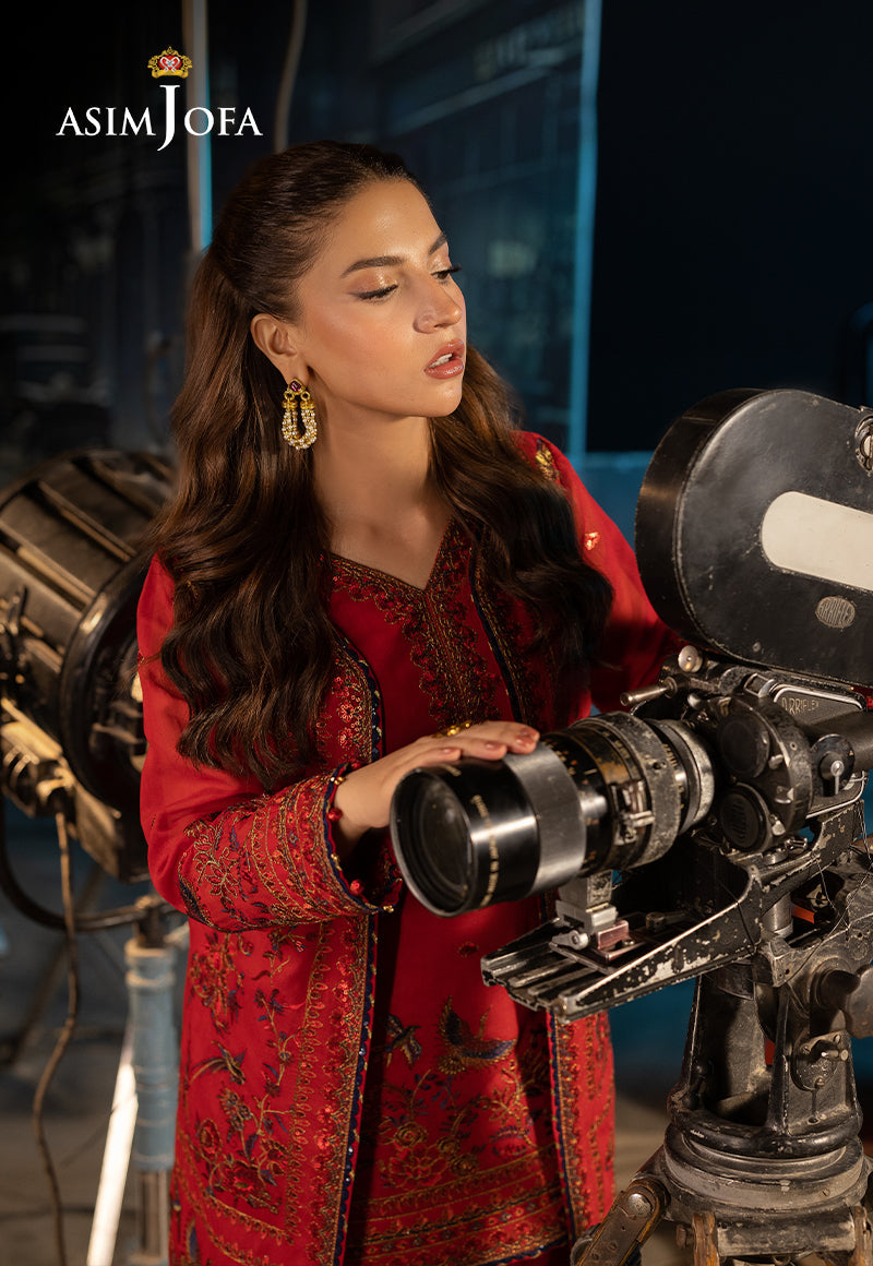 Merging timeless artistry with a contemporary flair, this red ensemble reimagines festive wear with striking originality. The cape, styled over a short shirt, channels vintage charm with a modern twist—its surface brought to life by intricate shikargah motifs embroidered in lustrous zari, radiant red sequins, and rich tones of navy blue, maroon, and red threadwork. Beneath it, the short shirt complements the grandeur with a finely detailed neckline and border that reflect the same ornate aesthetic. It's a powerful look that honors tradition while embracing bold, modern elegance.