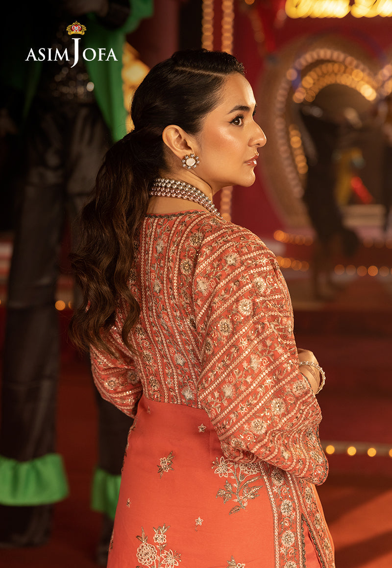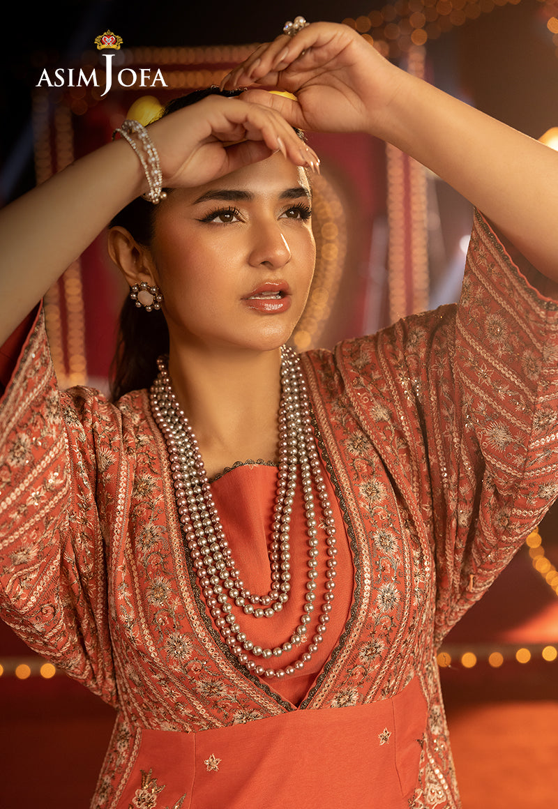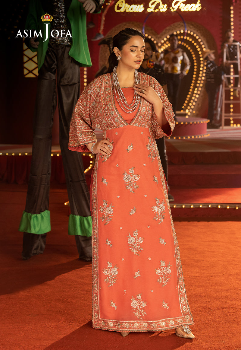 An artistic ode to elegance, this light coral ensemble redefines festive charm through its flowing kaftan silhouette. Designed to make a statement, the long kaftan features a heavily embroidered upper bodice that seamlessly extends into a cascade of floral motifs along its length. The embroidery glows with two-toned copper zari and light gold sequins, lending a radiant shimmer, while pale peach threadwork adds a delicate depth to the design. Ethereal yet impactful, this piece is perfect for the woman who embraces grace with a bold, contemporary spirit.
