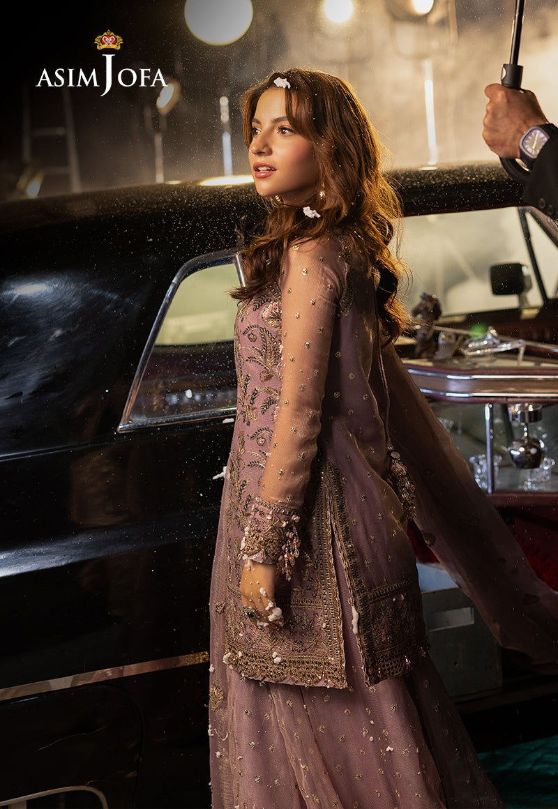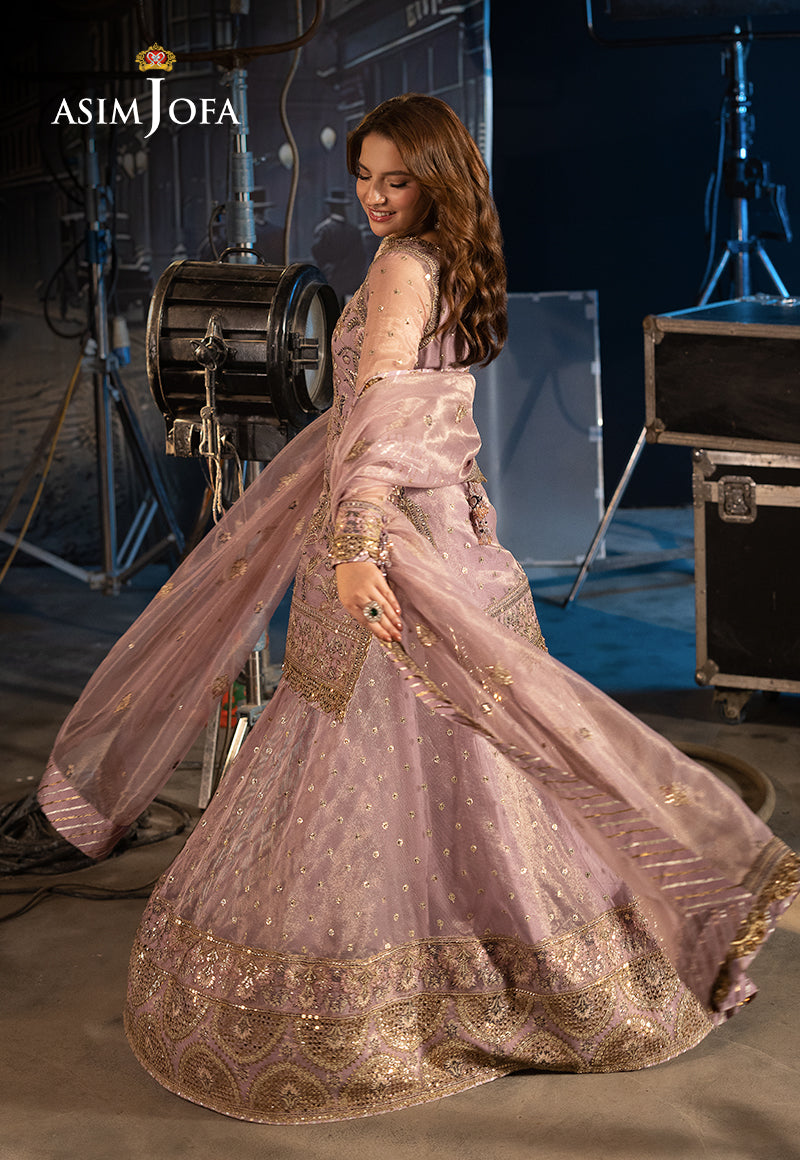 This pale lilac outfit is a poetic tribute to timeless elegance. The heavily embroidered shirt is adorned with an all-over pattern that shimmers with the brilliance of two-toned antique gold zari, 5mm sequins, and 3mm light gold cupped sequins, each element catching the light like glints of dawn. Threadwork in soft lilac and beige hues adds a dreamy softness, enriching the design with quiet allure. It is paired with a beautifully crafted dhaka pajama, featuring a richly embroidered border and a subtle sequined spray that lends graceful movement to the silhouette. A minimally embroidered dupatta completes the ensemble, offering balance to this breathtaking harmony of tradition and refinement.