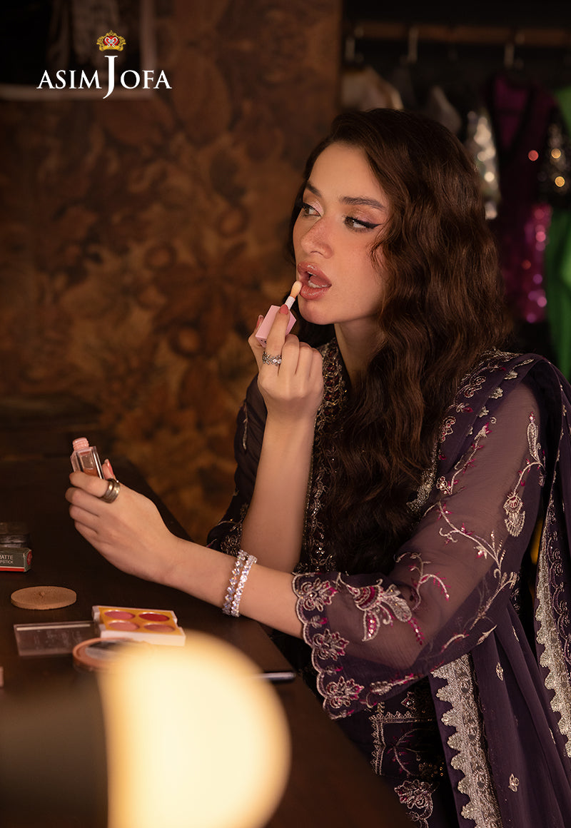 Like the rich pages of a royal manuscript, this purple ensemble with hints of gray, tells a story steeped in artistry. The shirt is adorned with zari and light gold sequins, interwoven with magenta threads that bring its distinct embroidery layout to life. Scalloped edges on the sleeves and hem add a touch of finesse, framing the intricate work with delicate charm. Paired with an embroidered trouser showcasing exquisite floral embroidery with scalloped hem and a beautifully embroidered dupatta, this ensemble is a celebration of regal grace and timeless style.