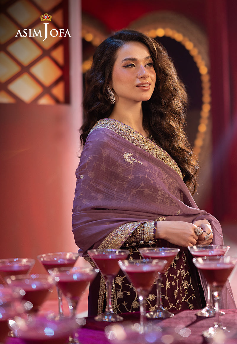 As if drawn from an ethereal garden, this plum ensemble enchants with its beauty. The shirt is adorned with an intricate web of gold zari and sequins, forming a foliage-inspired design that winds across the fabric. Every thread whispers a story of grace. Adding contrast and charm, the dupatta features scattered embroidered motifs that flutter like fallen petals—bringing movement, texture, and a breath of fresh elegance to this stunning creation.
