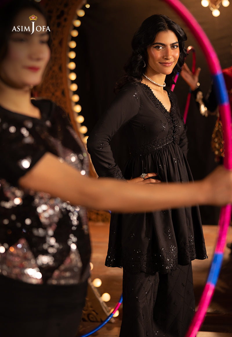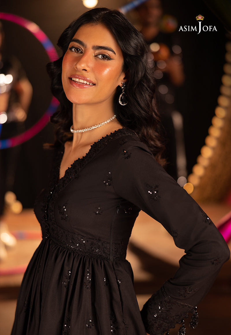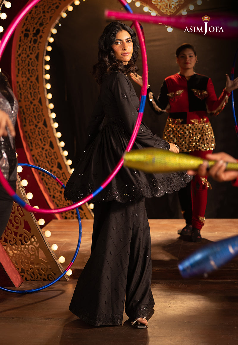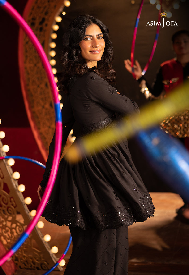 A sartorial ode to moody elegance, this black ensemble channels the spirit of Back to Black dark, soulful, and unforgettable. The peplum-style shirt is drenched in black-on-black magic, with tonal threadwork and sequins casting a shadowy shimmer that whispers luxury. It’s a look that doesn’t need to shout to be heard. Paired with embroidered trousers that echo its quiet intensity, this outfit captures a modern, edgy grace—just like the timeless rhythm of a song that lingers long after it ends.