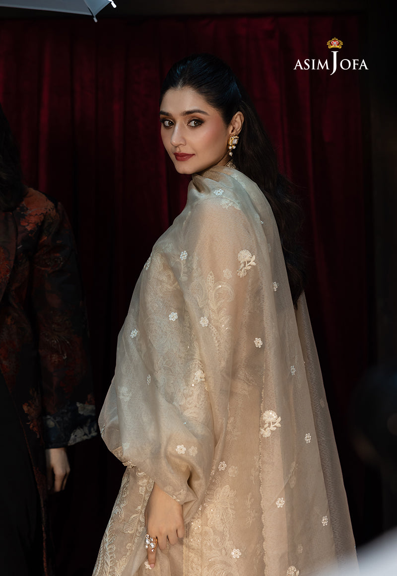 Breathtakingly gorgeous, this beige ensemble is a vision of timeless refinement. The front-open jacket-style shirt is a delicate tapestry of dull ivory threads and glistening transparent sequins, creating a subtle play of light and texture. Scalloped detailing along the hem adds a graceful finish, echoing the soft allure of the overall design. Paired with a beautifully embroidered dupatta that drapes like a whisper, this look is effortlessly graceful—perfect for those who find beauty in the quietest details.