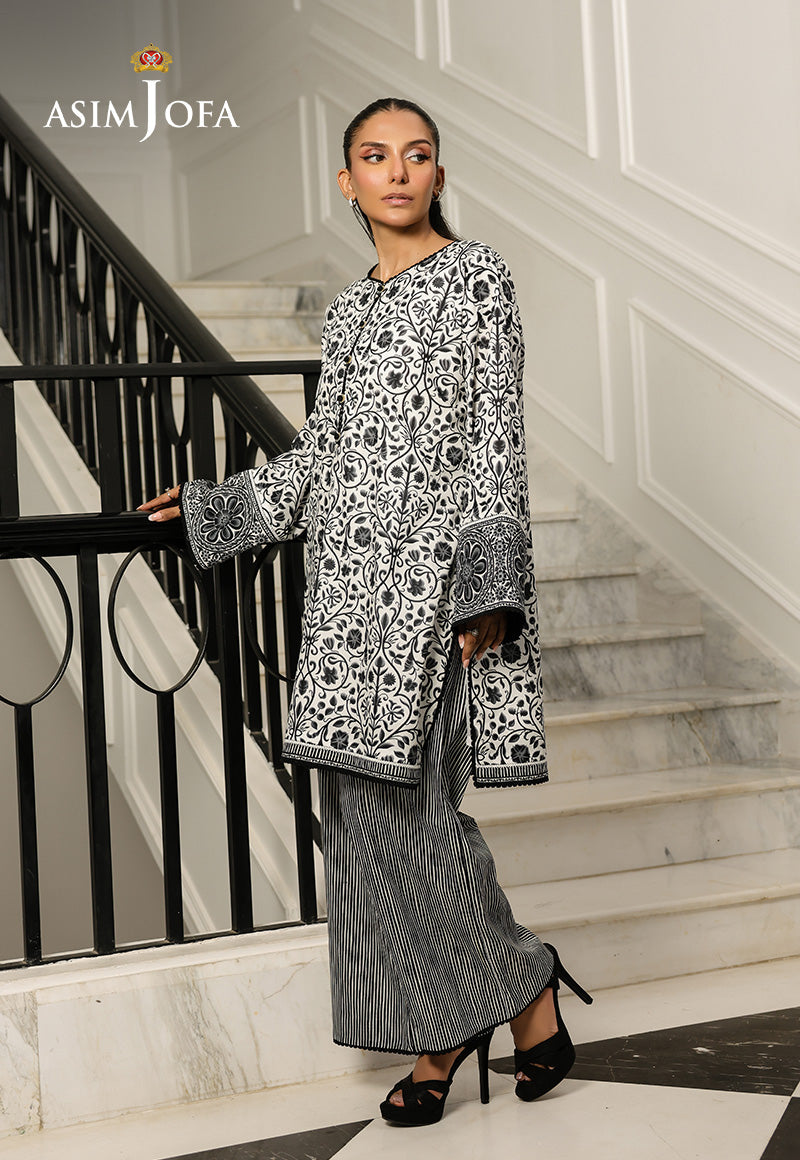 Nature’s narrative in noir. The shirt is adorned with a flowing floral print that seems to drift effortlessly across the fabric, lending the outfit a poetic elegance. Paired with trousers featuring a unique woodgrain-textured print, this ensemble becomes an artistic ode to natural beauty in monochrome.