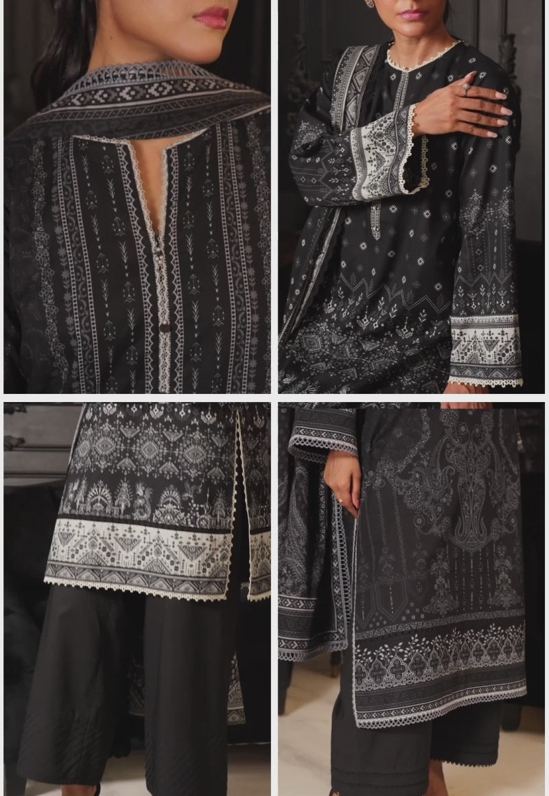 Depth in detail, a study in texture and tone, this black shirt features a refined print in light shades, giving the fabric a layered feel. The ensemble is paired with a printed dupatta that mirrors the shirt’s quiet complexity, creating a cohesive and polished look.