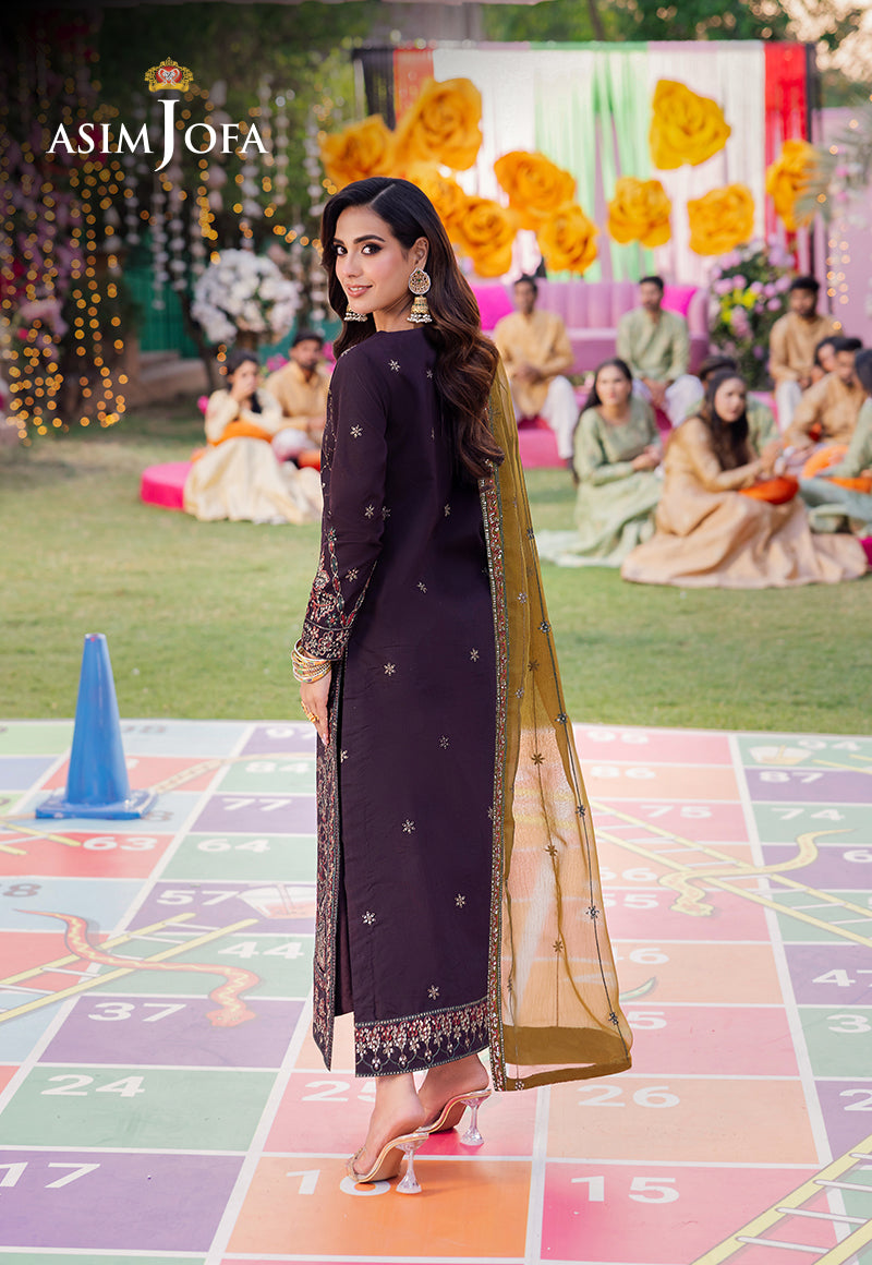 Revel in the magnificence of Asim Jofa’s “Jag Mag Collection” with this exquisite brown ensemble. The outfit is a canvas of celebration featuring an embroidered neckline that cascades down the front culminating in a grand daman, adorned with light gold 3mm sequins that catch the light with every movement. The two-toned zari and rust and green threadwork are meticulously woven to create motifs that tell a story of festivity. Accompanied by a mehndi green dupatta embroidered on the borders, this attire is designed to keep you radiant through every festivity.