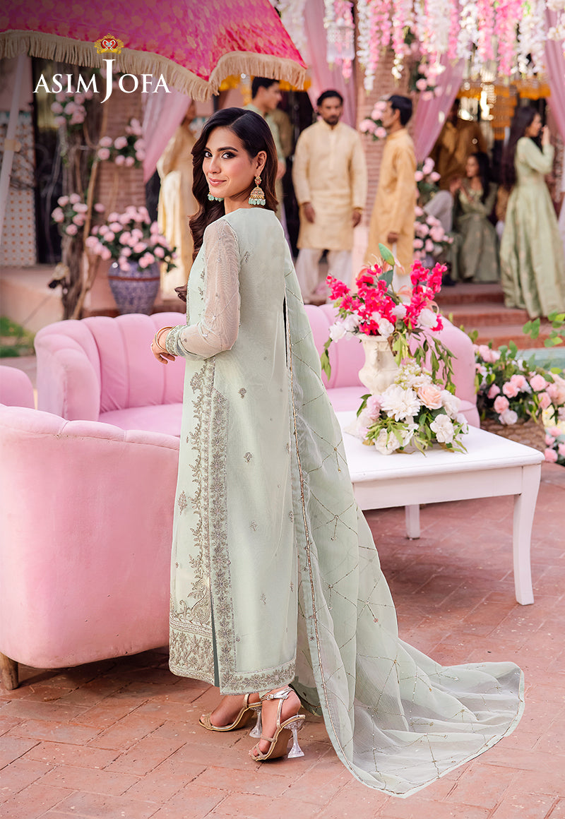Asim Jofa unveils the “Jag Mag Collection” with this creation where it meets magnificence. This mint number is a symphony of craftsmanship. The neckline of this outfit blooms with intricate embroidery cascading down to the borders in a mesmerizing dance of two-toned zariwork. Each golden sequin twinkles while illuminating the fabric. The traditional motifs tell stories of heritage and joy while the matching embroidered dupatta completes the celestial ensemble. Be the radiant center of every celebration with this luminous creation.