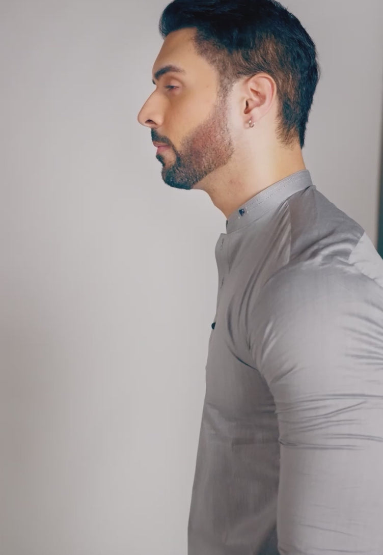 This grey cotton kurta pajama set merges modernity with heritage, creating a look that’s both polished and poised. The tone is subtle yet confident—perfect for the man who makes a statement with his presence.