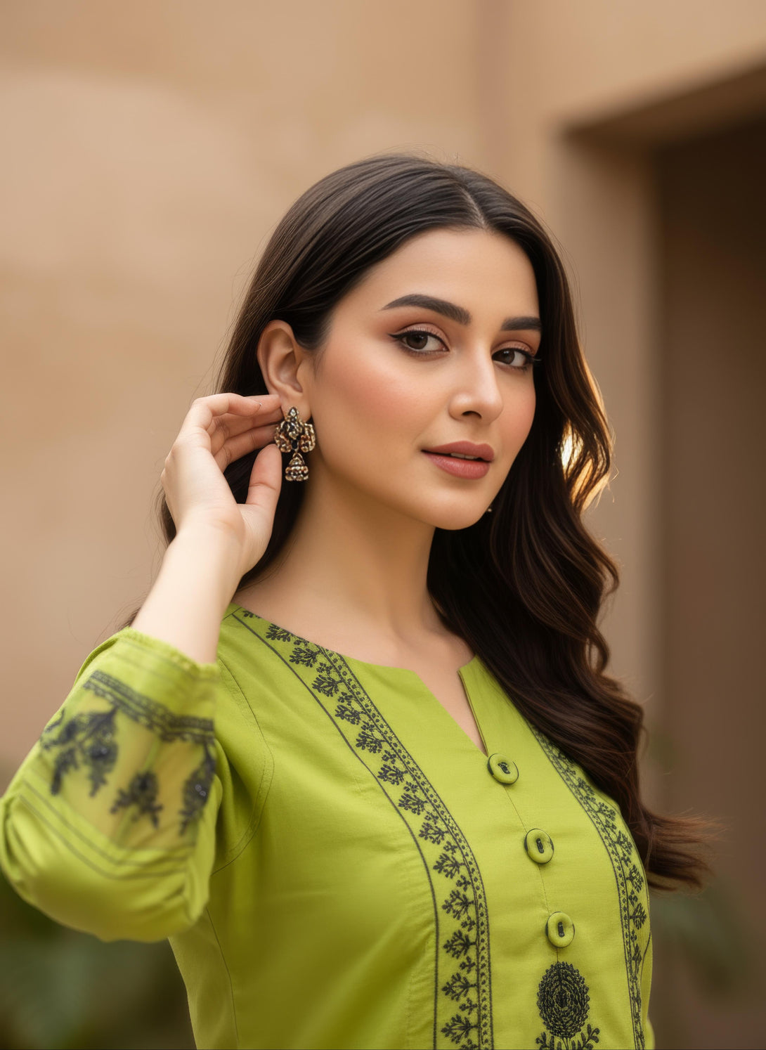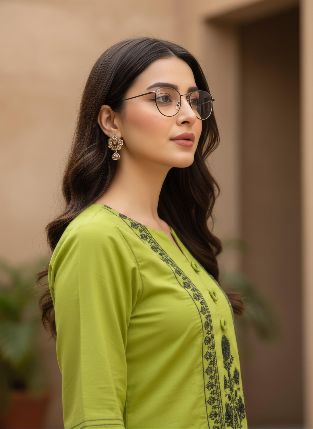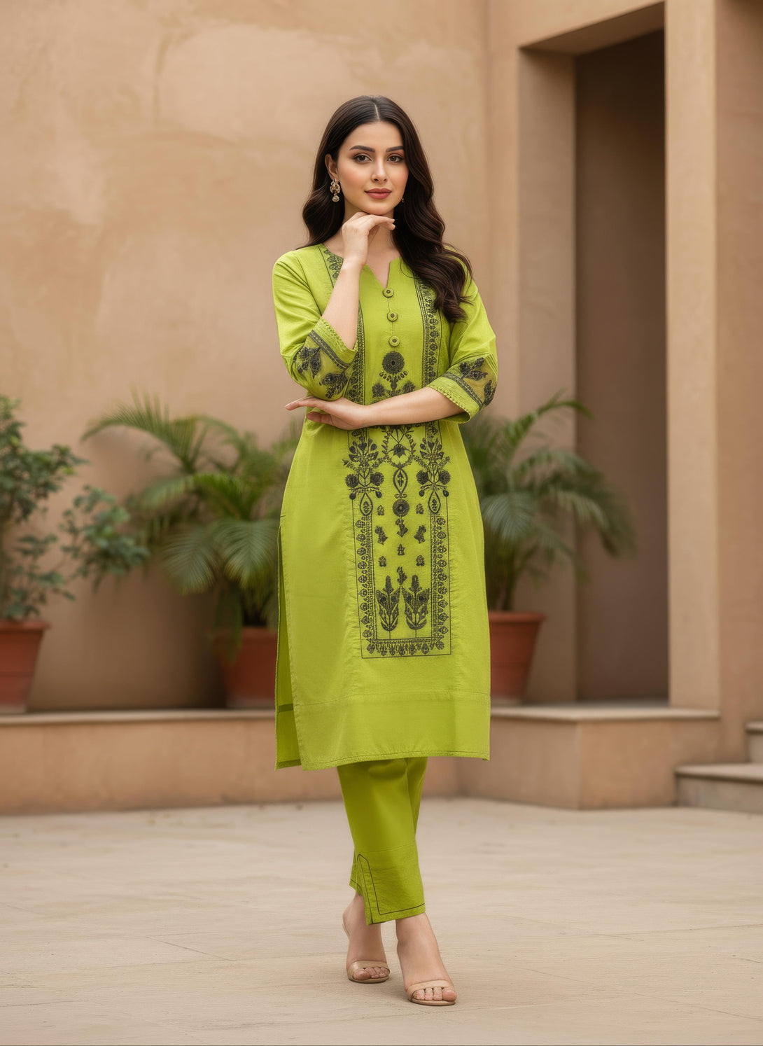 Soft yet striking, this pink ensemble exhibits contemporary elegance. The shirt is beautifully embroidered with delicate leaf motifs, creating a harmonious natural vibe, while the stunning neckline, adorned with lace detailing, adds a touch of sophistication. The sleeves are enhanced with exquisite embroidery along the borders, elevating the overall design. Paired with stylish trousers that complement the outfit’s refined look, this ensemble is a perfect expression of modern femininity and timeless charm.