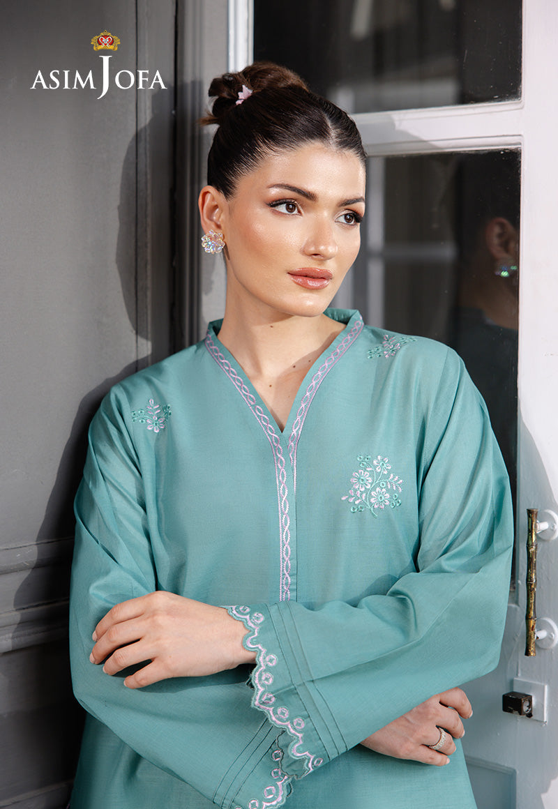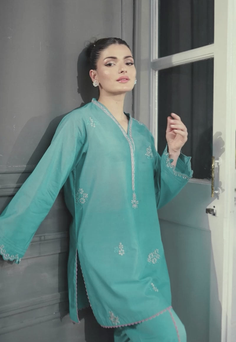 This green ensemble embodies understated elegance with its shirt adorned in delicately scattered floral embroidered motifs. Paired with tulip-style trousers featuring graceful lace detailing, it’s a refined choice for effortless charm.