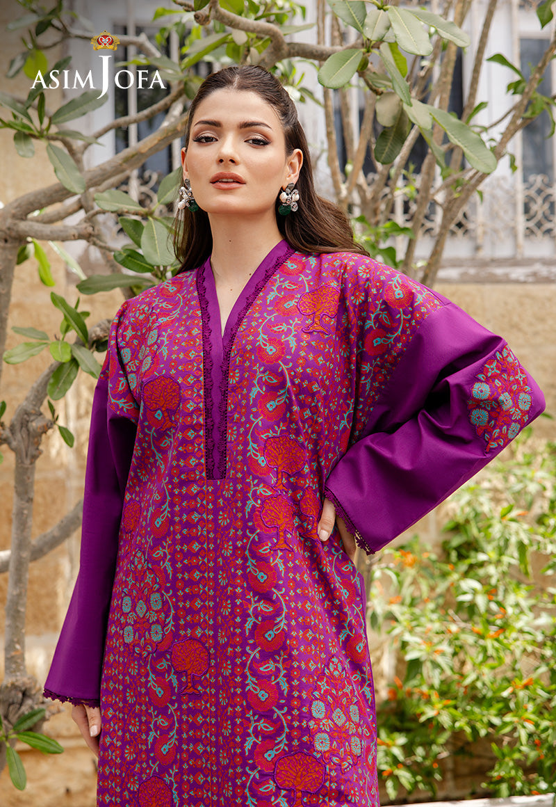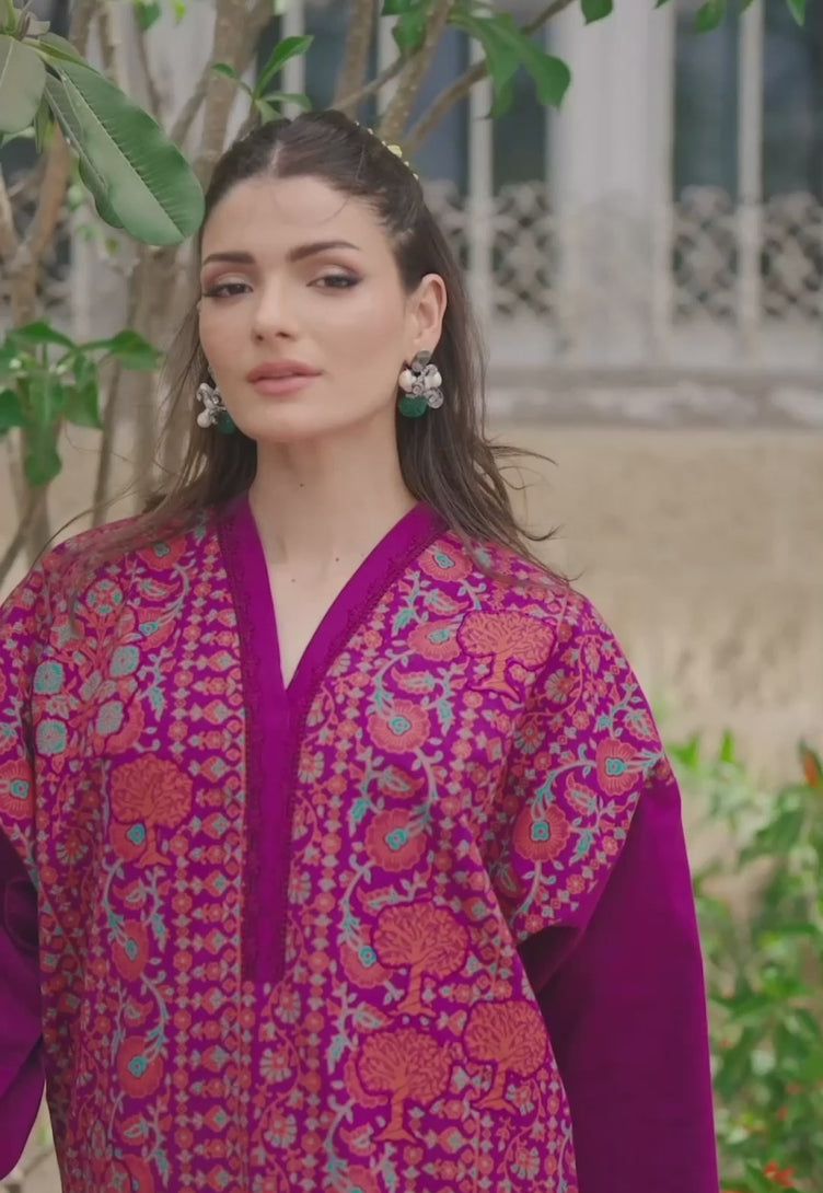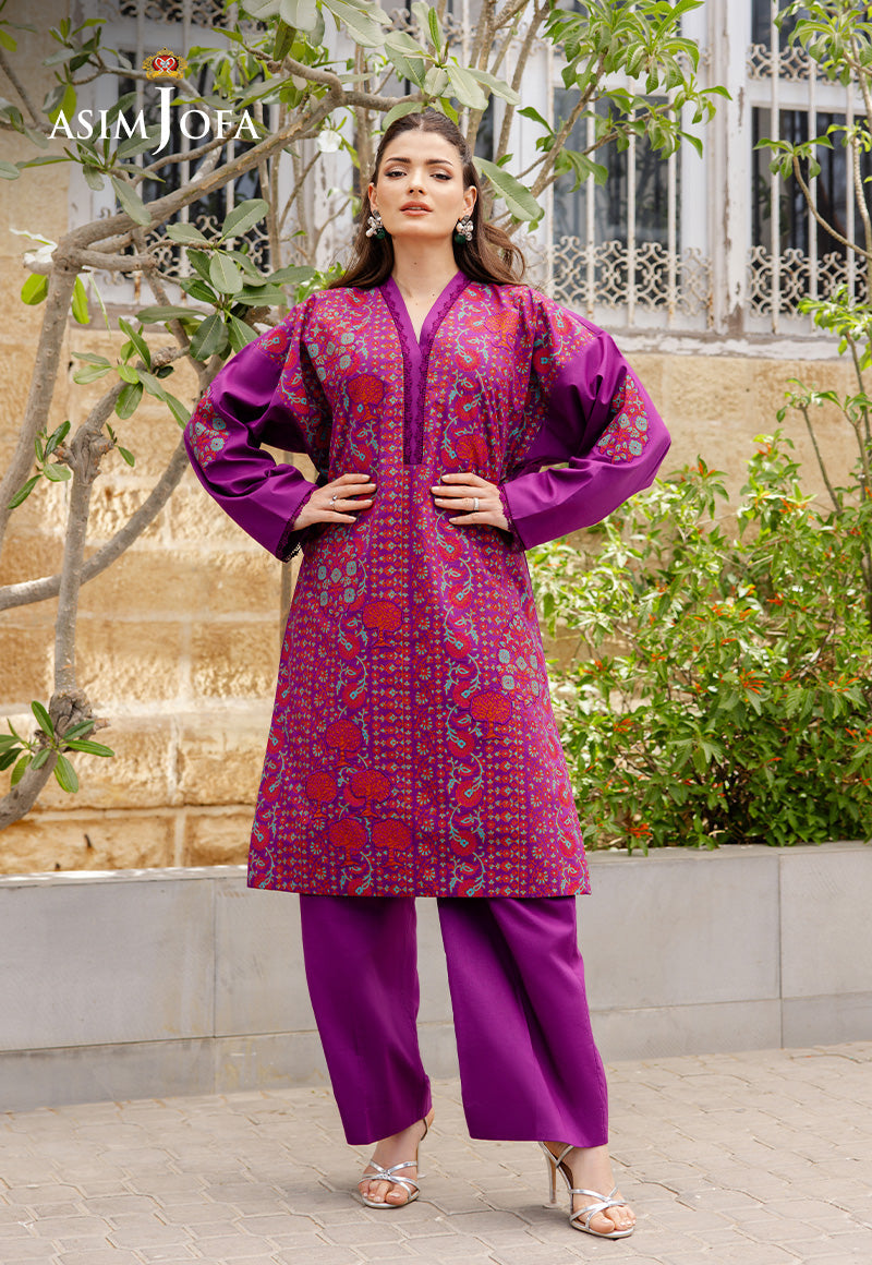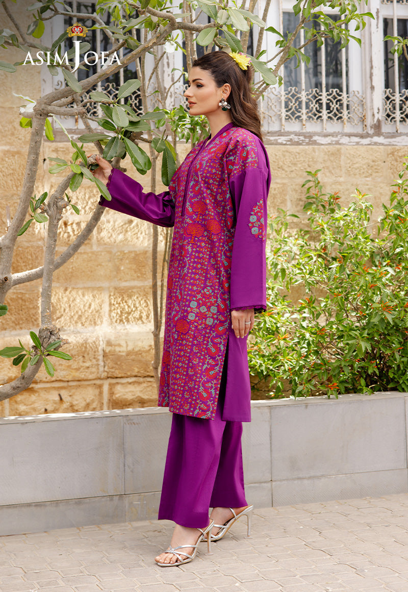 Rendered in deep purple, this ensemble stands out with its richly printed shirt, enhanced by embossed embroidered appliqués across the front and sleeves. Stylishly tailored trousers complete the outfit, making it a refined choice for festive afternoons and elegant occasions alike.