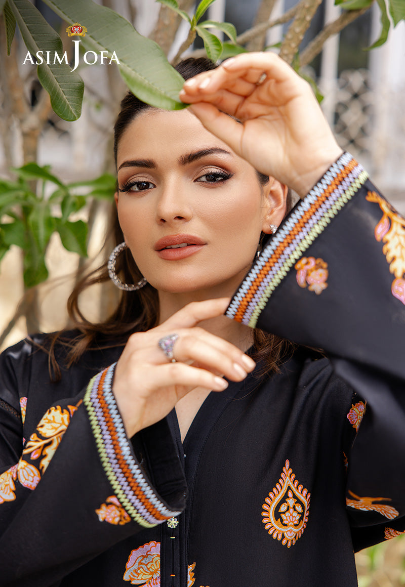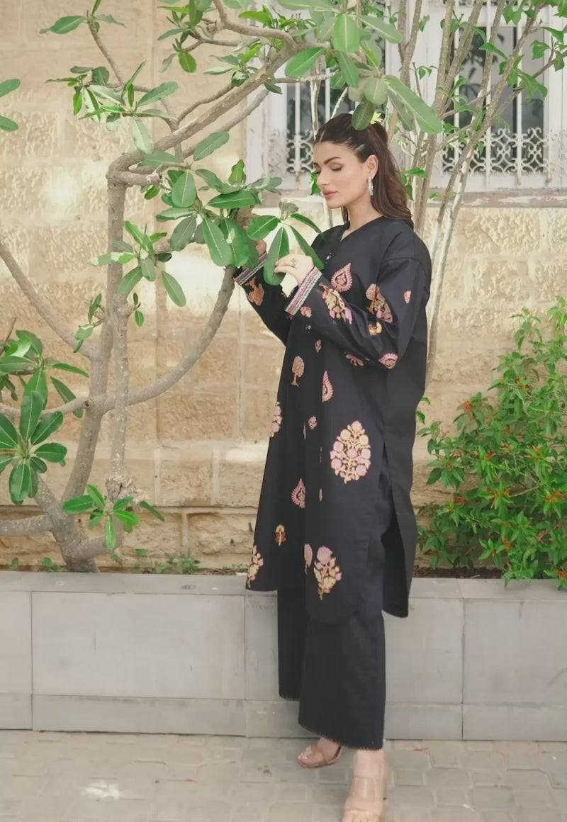 This timeless black ensemble is a graceful nod to tradition. The shirt showcases classic motifs that flow effortlessly across the fabric, while the modern cut of the trousers brings a fresh perspective. A poised and graceful look for versatile styling.