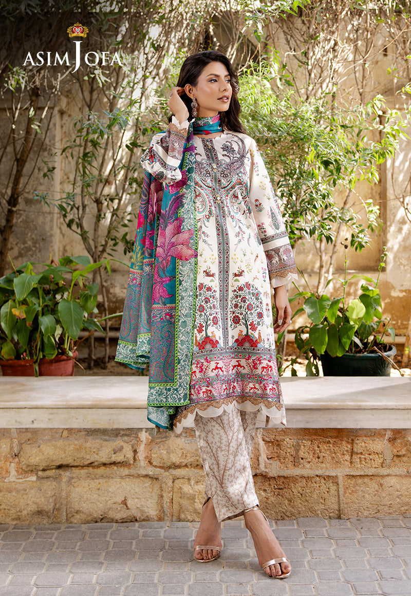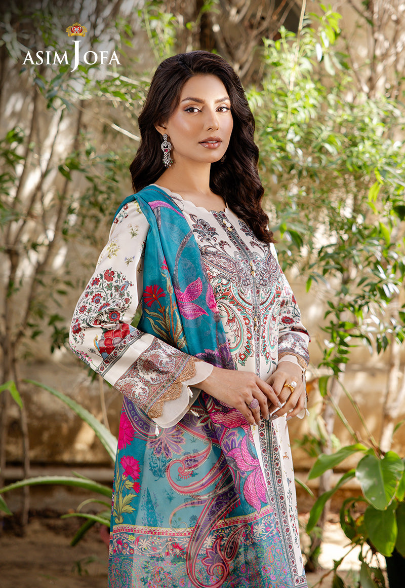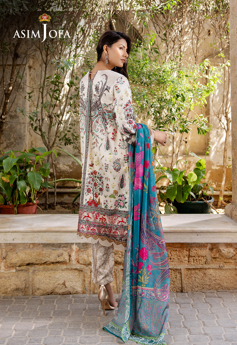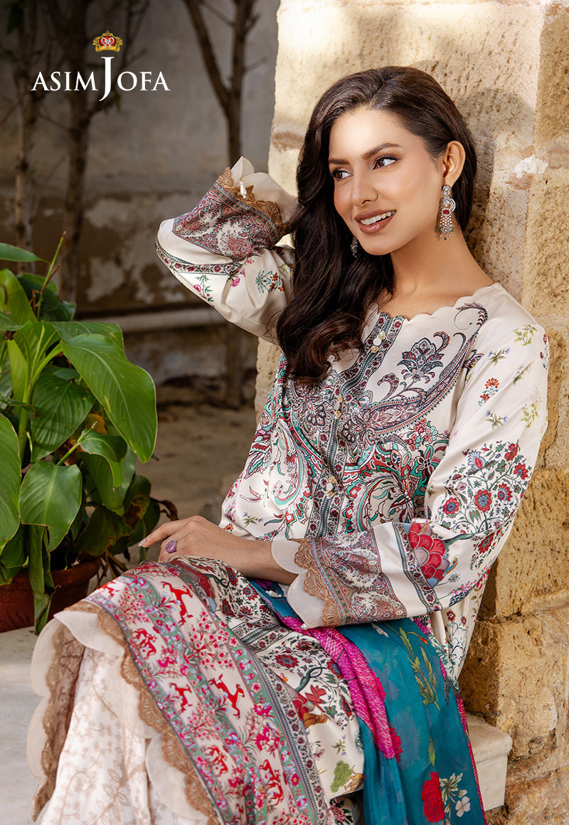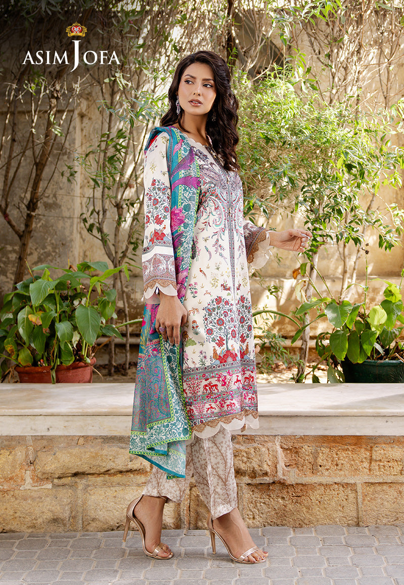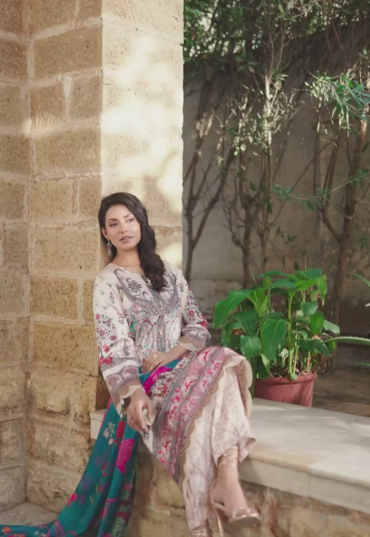 This cream ensemble showcases a silky-textured shirt that serves as the perfect canvas for a vibrant, exuberant print. It's paired with printed trousers adorned in earthy tones and complemented by a multihued printed dupatta, creating a look that's as lively as the woman it’s made for.