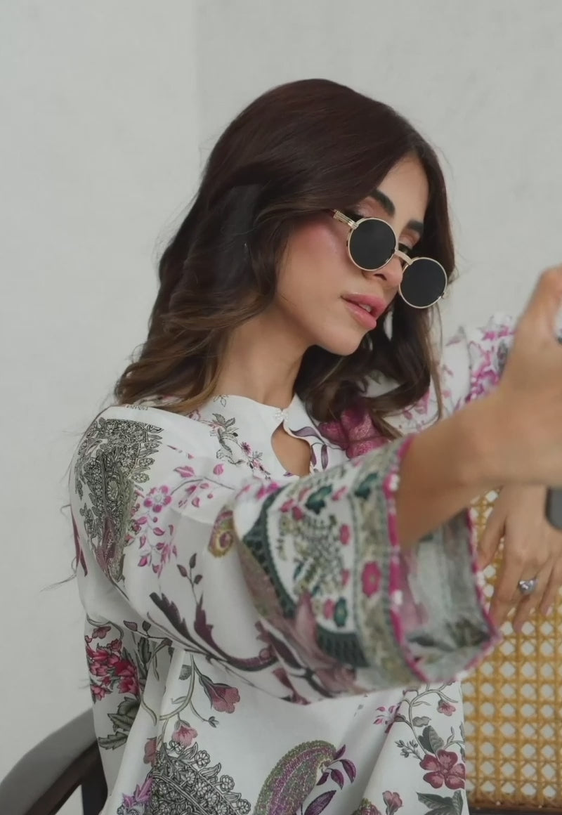Creative and captivating, this light green ensemble is alive with artistic flair. The shirt is adorned with expressive, art-inspired patterns, complemented by equally eye-catching printed trousers. A spirited choice for the bold and style-savvy.