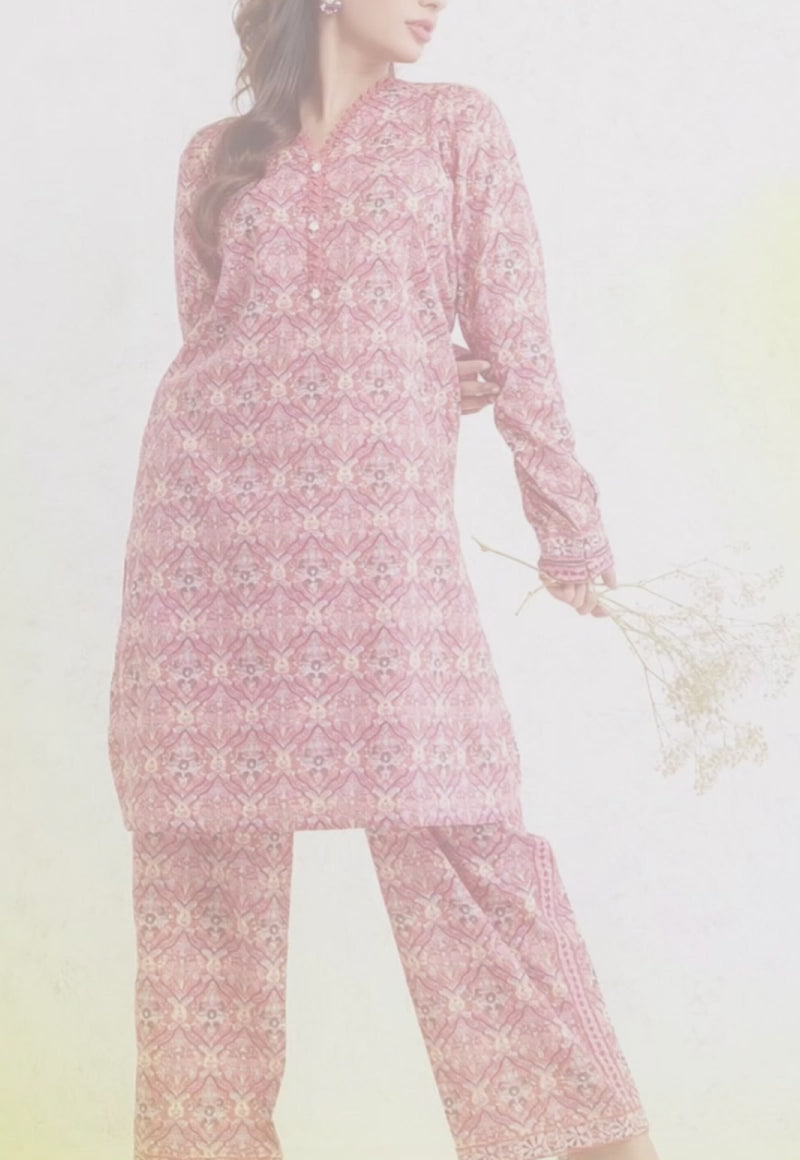 This pink ensemble radiates chic charm with its all-over printed shirt and trousers, creating a playful yet polished look. The neckline is adorned with elegant detailing, adding a stylish flair that completes the ensemble with effortless grace.