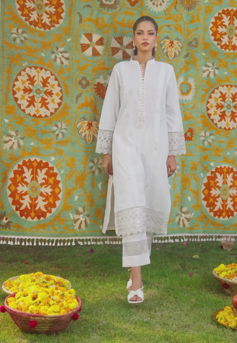 Breathe elegance into your wardrobe with this timeless white shirt exuding refined elegance with intricate detailing along the neckline, complemented by delicate embroidery on the sleeves and hem—perfect for a timeless, graceful look.