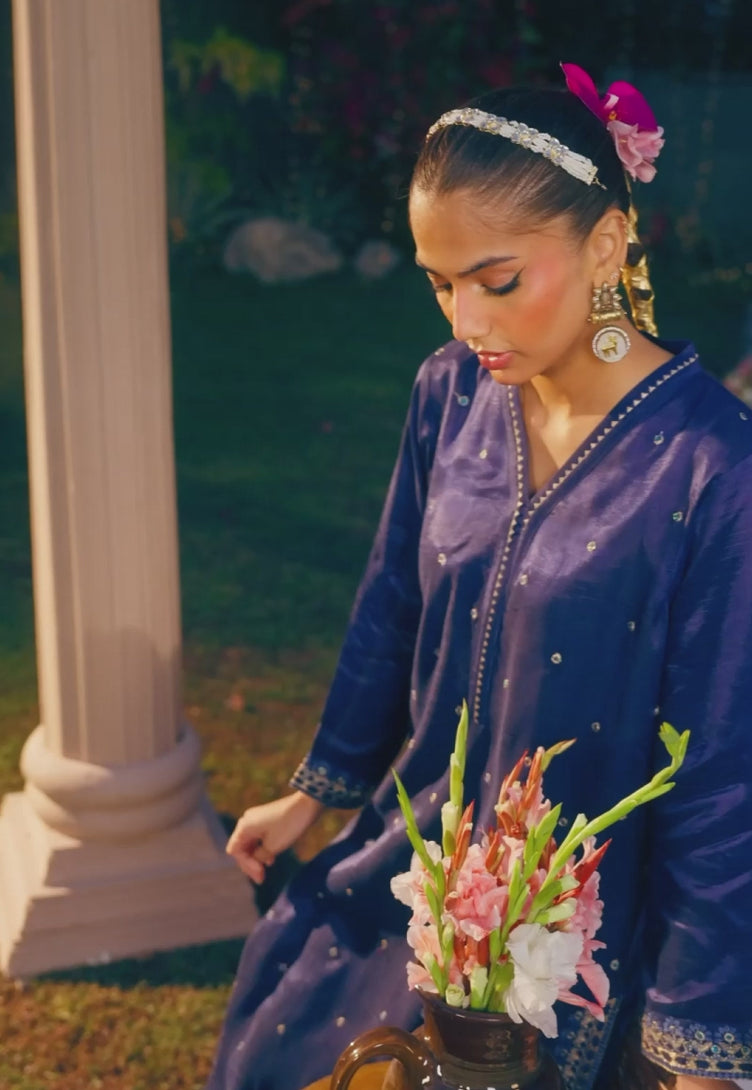 Radiating quiet sophistication, this minimalistic blue ensemble features a lustrous fabric that forms the perfect canvas for subtle embroidery on the shirt’s front and sleeves. Stunning embroidery along the edges and hem beautifully frames the look, paired effortlessly with sleek, tailored trousers.