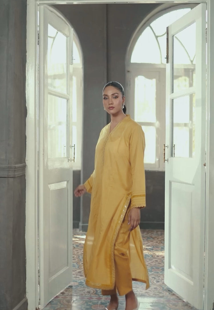 A vision of serenity, this ensemble redefines simplicity with its shirt adorned in minimal embroidery along the neckline and edges, enhanced by thoughtful styling details throughout. Paired with sleekly crafted trousers, it offers a refined and composed look with effortless charm.