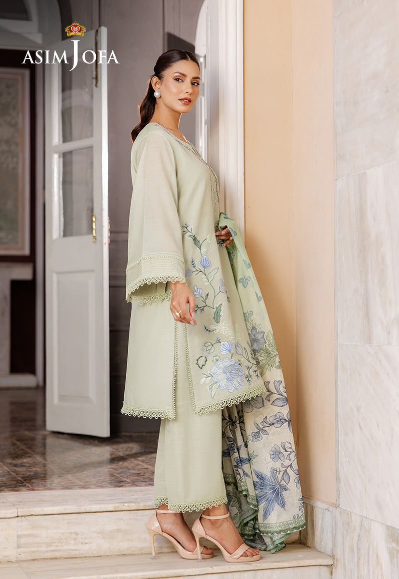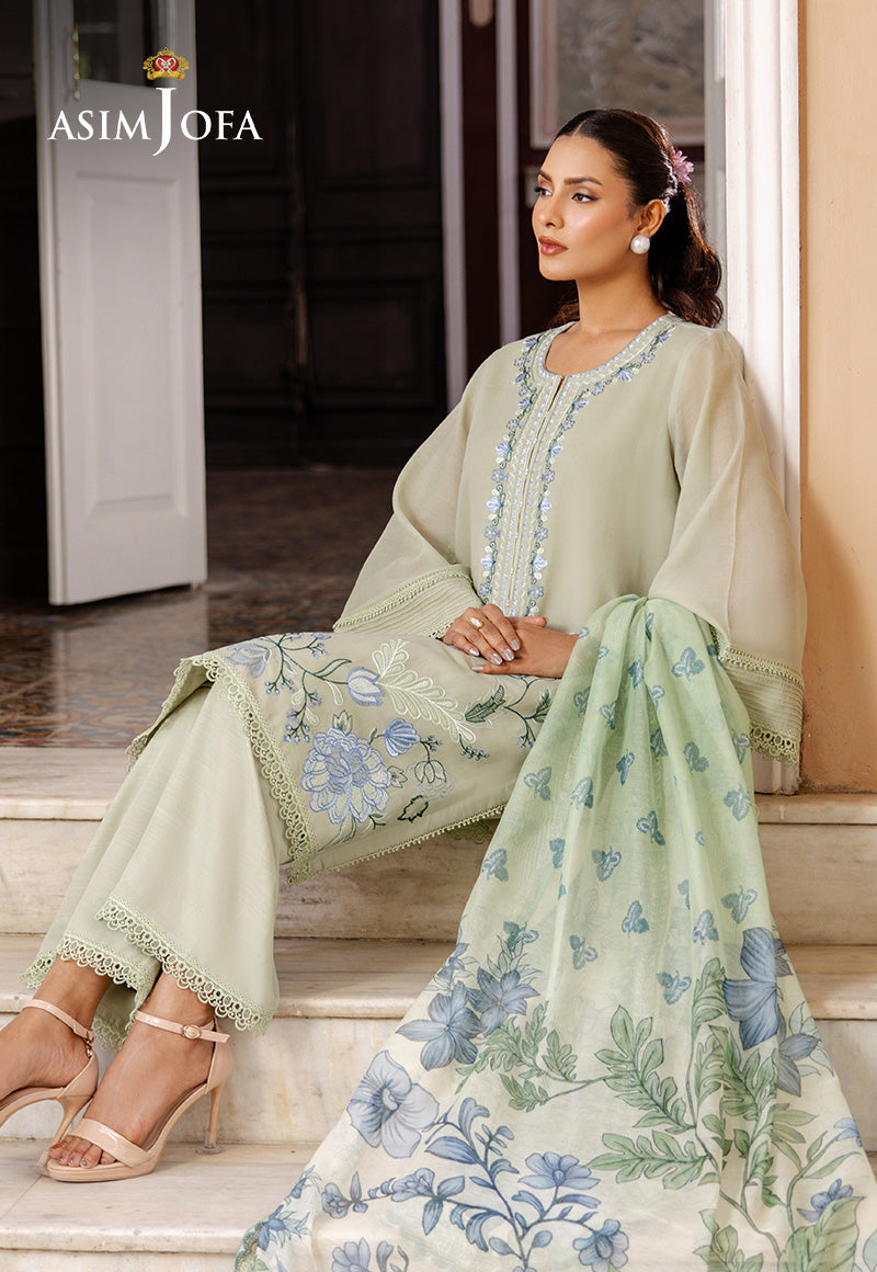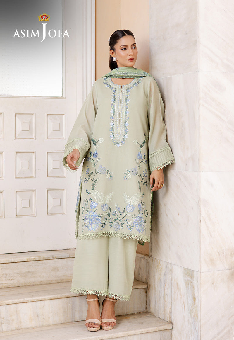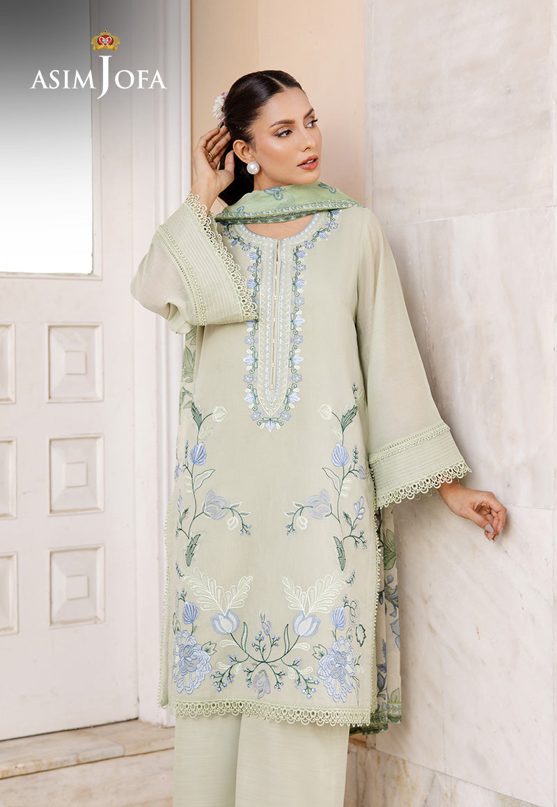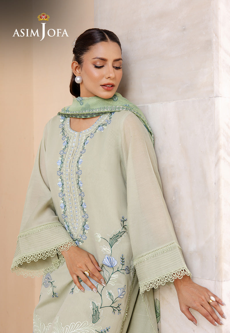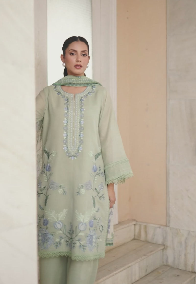A vision of pastel perfection, this outfit features a shirt adorned with a blend of tonal and contrasting pastel embroidery, elevated by intricate lace detailing throughout. Paired with stylishly tailored trousers and a beautifully printed dupatta, it captures the essence of soft elegance and refined charm.