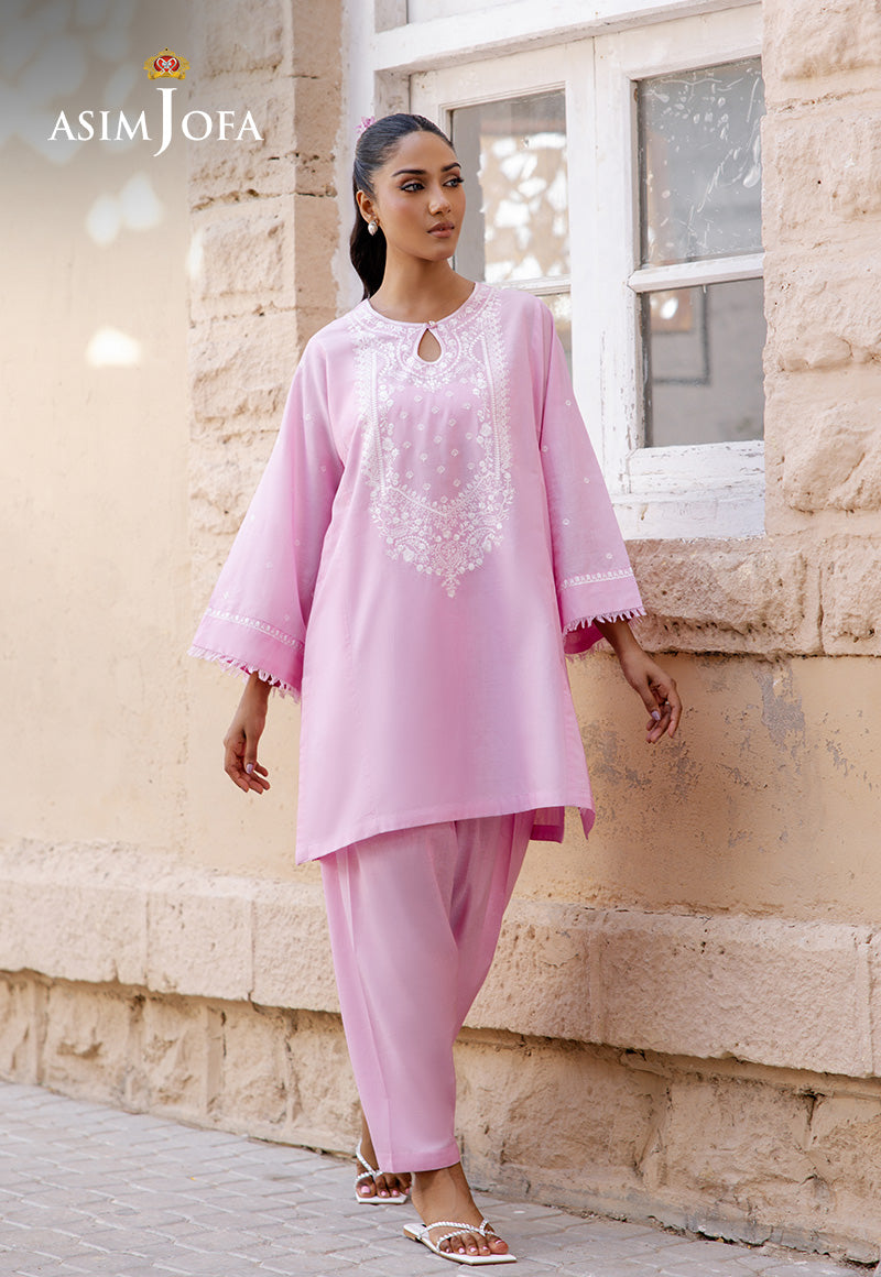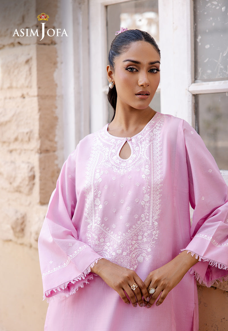 A portrait of pastel perfection, this pink outfit showcases a beautifully crafted neckline adorned with ivory-hued threadwork, adding delicate texture and charm, enhanced by the subtle detailing on the sleeves. Paired with neatly tailored trousers, it’s an effortlessly graceful ensemble for any occasion.