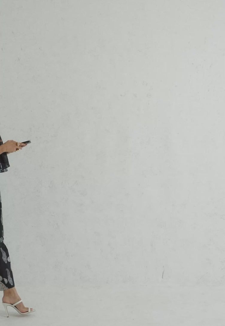 This black outfit offers a cohesive and refined look, with the shirt and trousers adorned in an elegant paisley print. It’s paired with a lightweight dupatta featuring a delicate floral pattern, striking the perfect balance between tradition and modern charm.