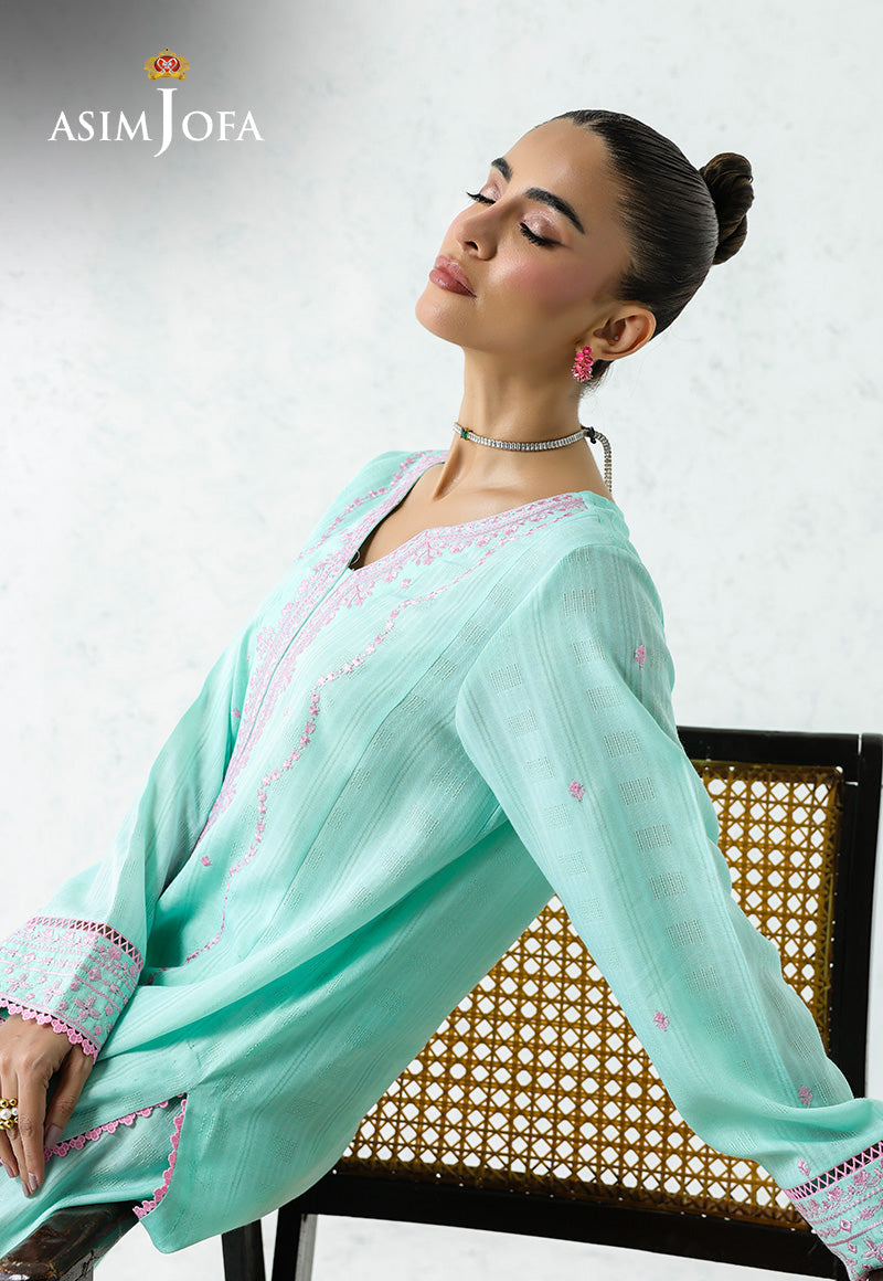 This light blue outfit exudes soft sophistication with intricate pastel-hued embroidery on the shirt, highlighted by charming pink accents that add a delicate contrast. Paired with beautifully embroidered trousers, it’s a graceful ensemble perfect for serene daytime moments.
