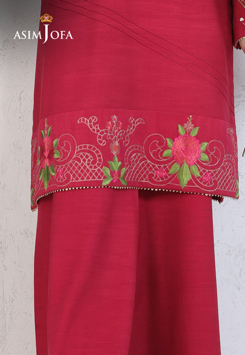 Bold and captivating, this red outfit features a shirt with gorgeously embroidered border and sleeves that elevate its overall appeal. Paired with sleek, beautifully tailored trousers and a gorgeous printed dupatta, making it a striking ensemble that exudes confidence and charm.
