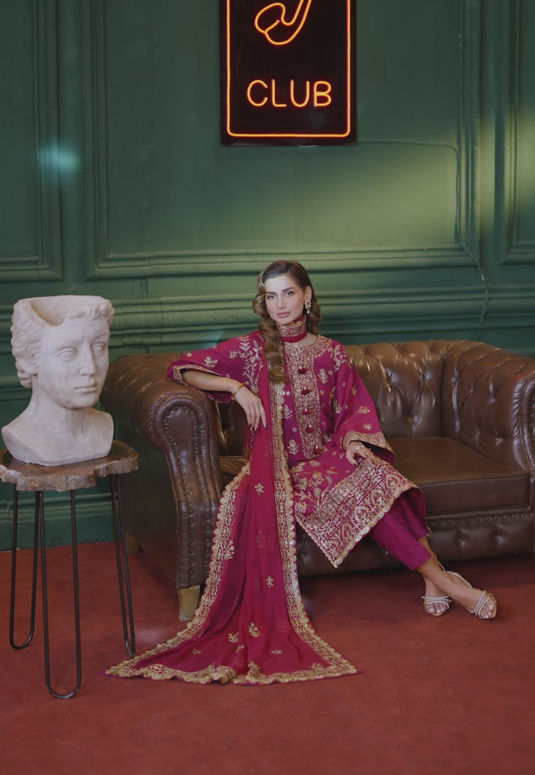 Radiate regal charm in this mesmerizing magenta ensemble. The beautifully crafted shirt boasts a stunning neckline and a heavily adorned border, while gorgeous motifs are scattered across the shirt and sleeves, adding depth to the design. Gold zari and cupped gold sequins lend a luminous glow, perfectly complemented by subtle beige threadwork for a refined contrast. Paired with an airy chiffon embroidered dupatta, this ensemble is a perfect balance of grace and grandeur.