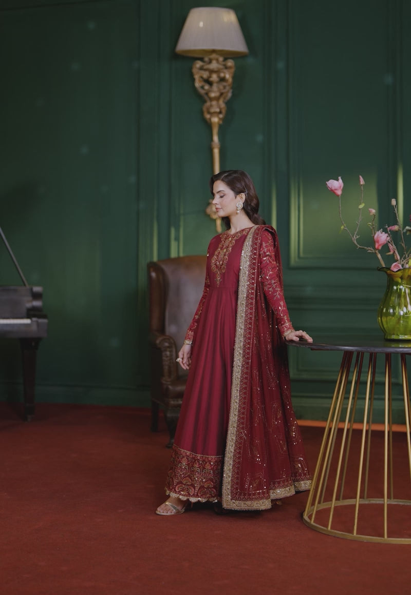 Command attention in this regal maroon peshwas, a masterpiece of intricate craftsmanship. The embroidered neckline sets an opulent tone, leading into a gracefully flowing silhouette accentuated by a richly detailed border and delicately adorned sleeves. Elevating the look is an exquisitely embroidered dupatta, adding the perfect touch of grandeur. Designed for those who carry tradition with a modern edge, this ensemble is pure sophistication in motion.