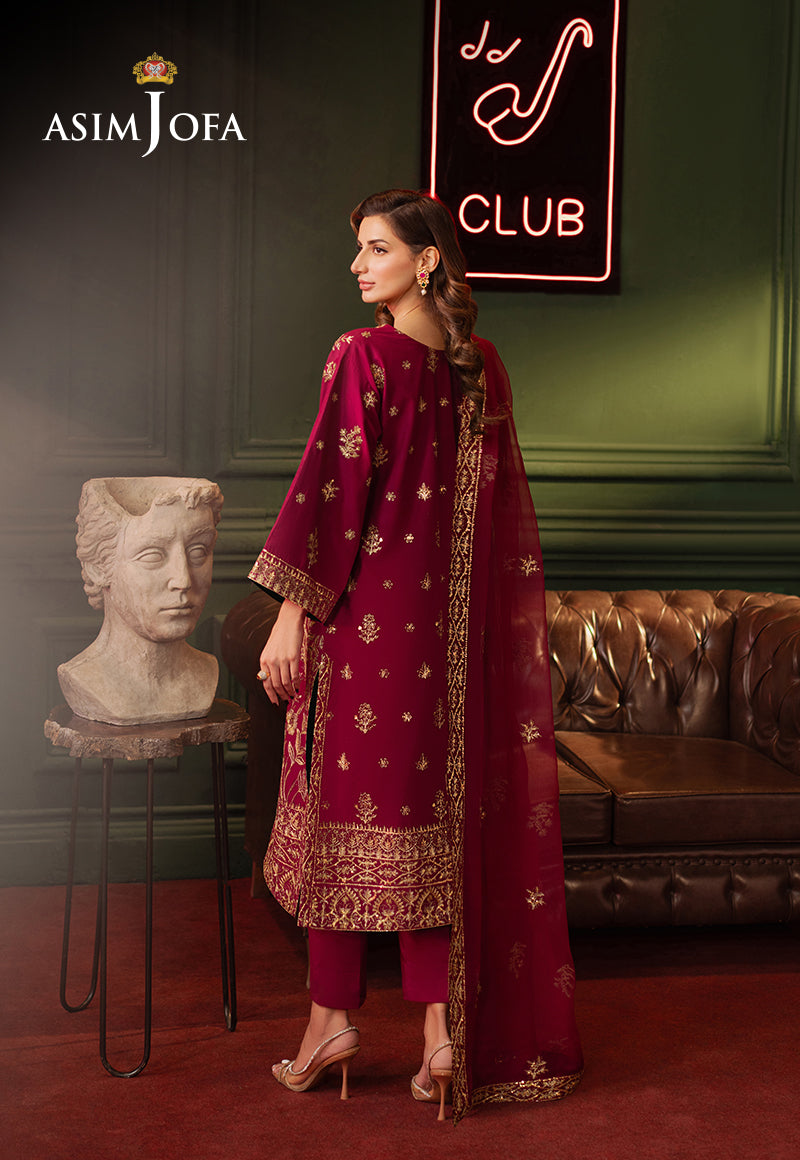 Radiate regal charm in this mesmerizing magenta ensemble. The beautifully crafted shirt boasts a stunning neckline and a heavily adorned border, while gorgeous motifs are scattered across the shirt and sleeves, adding depth to the design. Gold zari and cupped gold sequins lend a luminous glow, perfectly complemented by subtle beige threadwork for a refined contrast. Paired with an airy chiffon embroidered dupatta, this ensemble is a perfect balance of grace and grandeur.