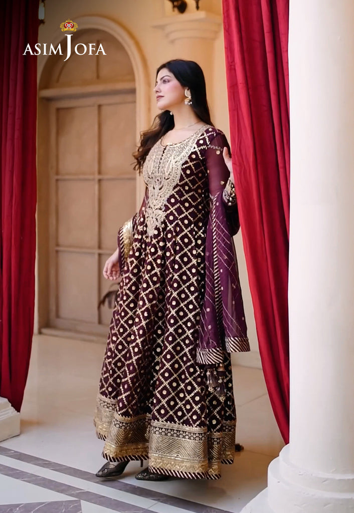 Unveil the majestic melody of our Plum Kalidar, a mesmerizing piece adorned with gold zariwork and 3mm sequins complemented by a lavish spread of golden embellishments that shimmer with every move. The rhythmic pattern on the kalis creates a harmonious blend while the embroidered neckline, hemline, and sleeves with border add a touch of regality. Paired with a dupatta featuring four side borders, this ensemble is a majestic plum melody that promises to make you the star of any event.